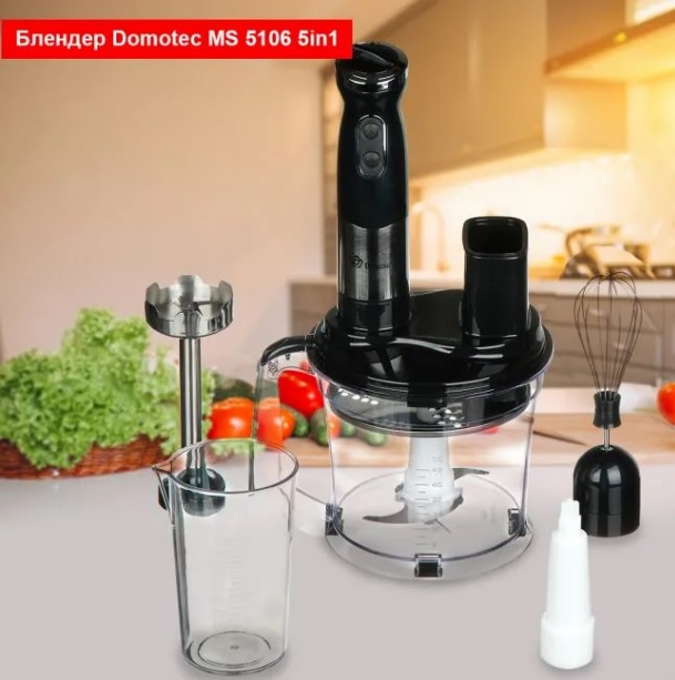 Электроприбор - вместительный блендер Domotec со стеклянным кувшином объемом 1,5 литра. Корпус блендера из высококачественного прочного пластика черного цвета и стали, чаша из прозрачного стекла. Мощность блендера 800 Вт и наличие двух скоростей позволяет подбирать оптимальный режим для любого продукта. Блендер Domotec MS 5106 5in1 легко справляется с большими объемами продуктов и выполняет свои функции на высоком уровне.Особенности стационарного блендера Domotec MS 5106 5in1