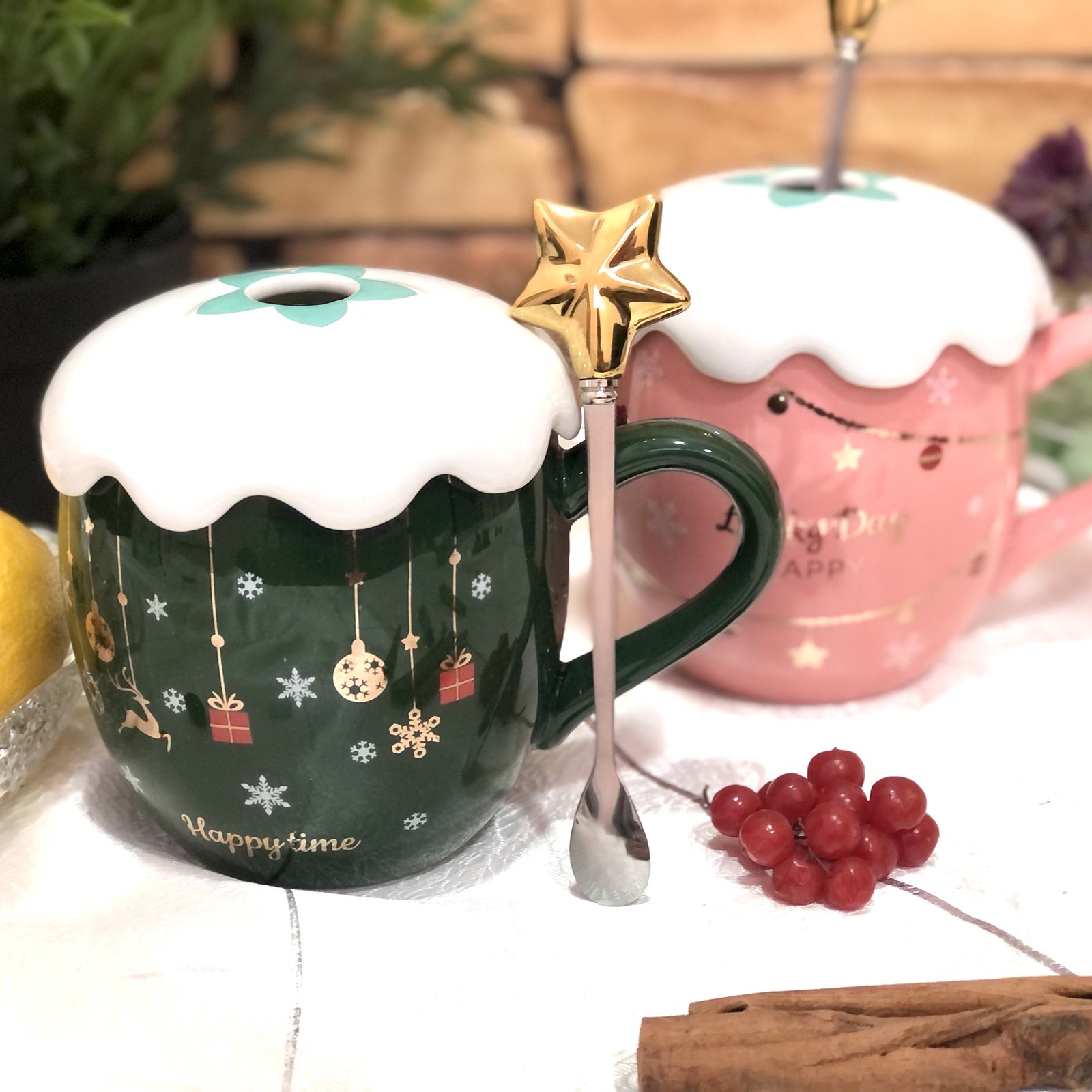 Керамическая чашка с крышкой оригинального дизайна и ложкой. Объем - 420 мл. Ручка на крышке в виде звездочки. Рисунок - новогодняя тематика.