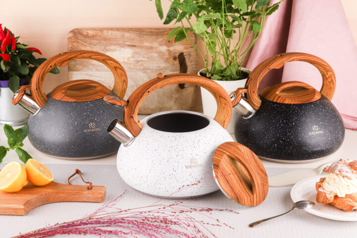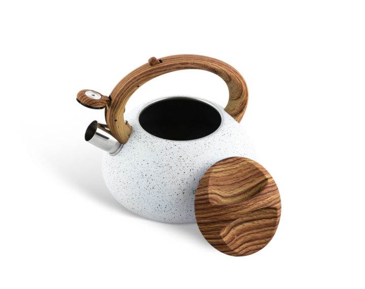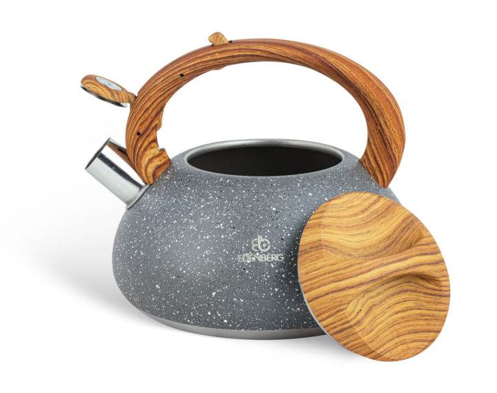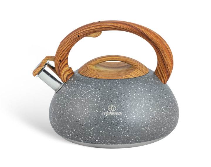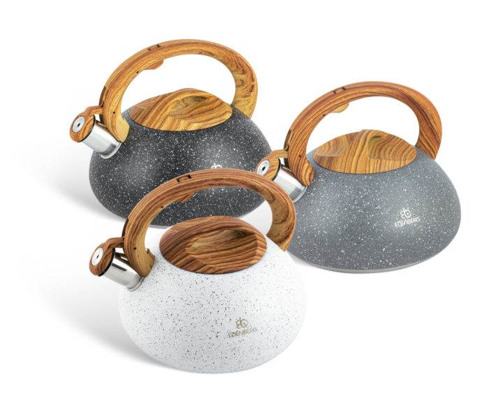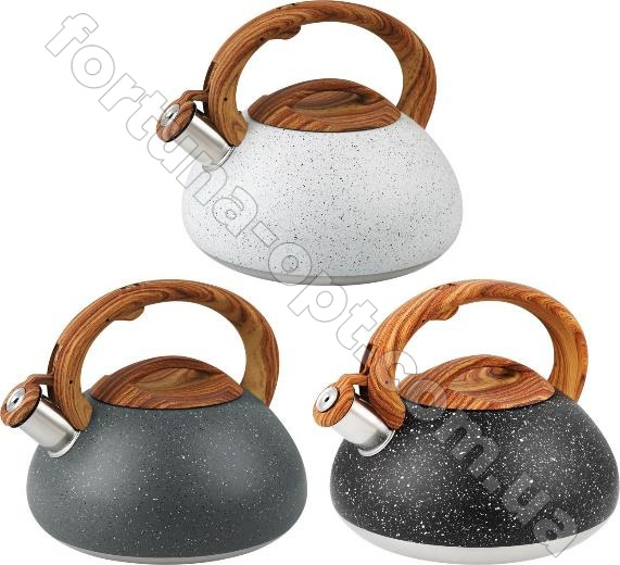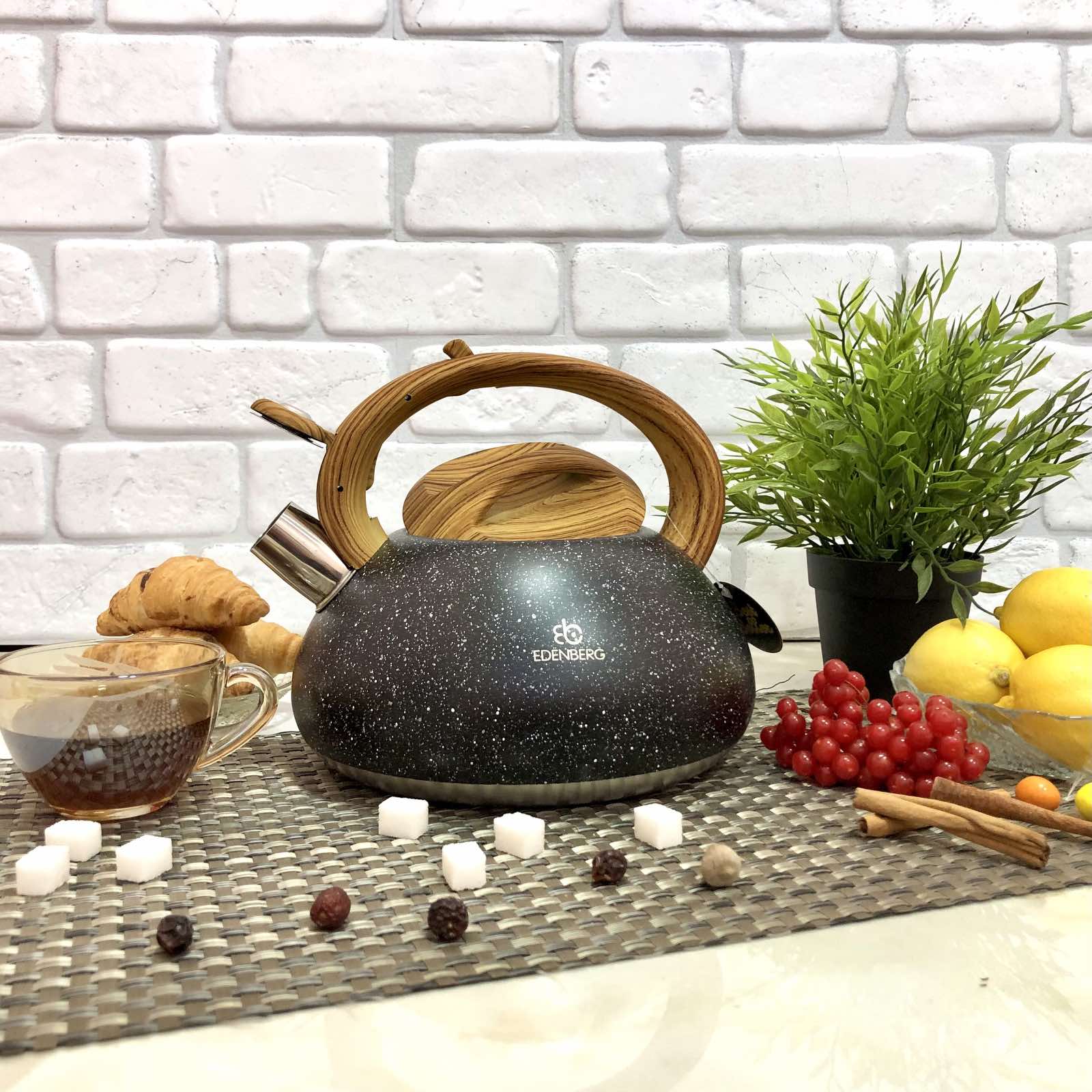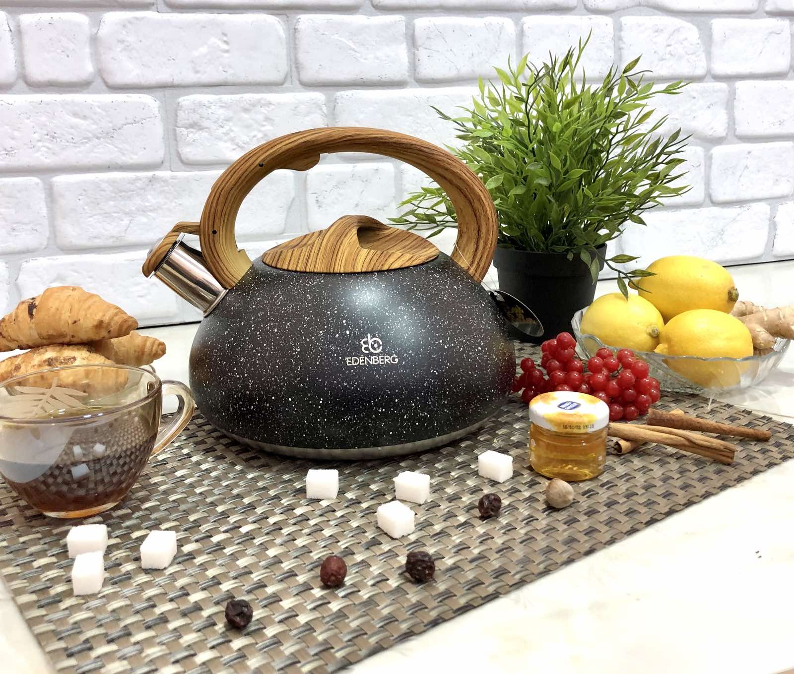 Чайник нержавеющий 8802 ТМ Edenberg со свистком, объемом 3 л. Дизайн - мраморное покрытие. Тяжелое дно, сферическая форма, мягкие ручки из бакелита, выполненные под дерево. 3 цвета - черный, серый, белый. Подходит для посудомоечной машины и всех видов плит, включая индукционные. Закипание сопровождается звуковым сигналом, так как носик чайника имеет насадку-свисток, что позволяет контролировать процесс кипячения воды. Специальный механизм позволяет легко и удобно открывать насадку-свисток одним нажатием кнопки.Особенности чайника нержавейка Edenberg EB - 8802