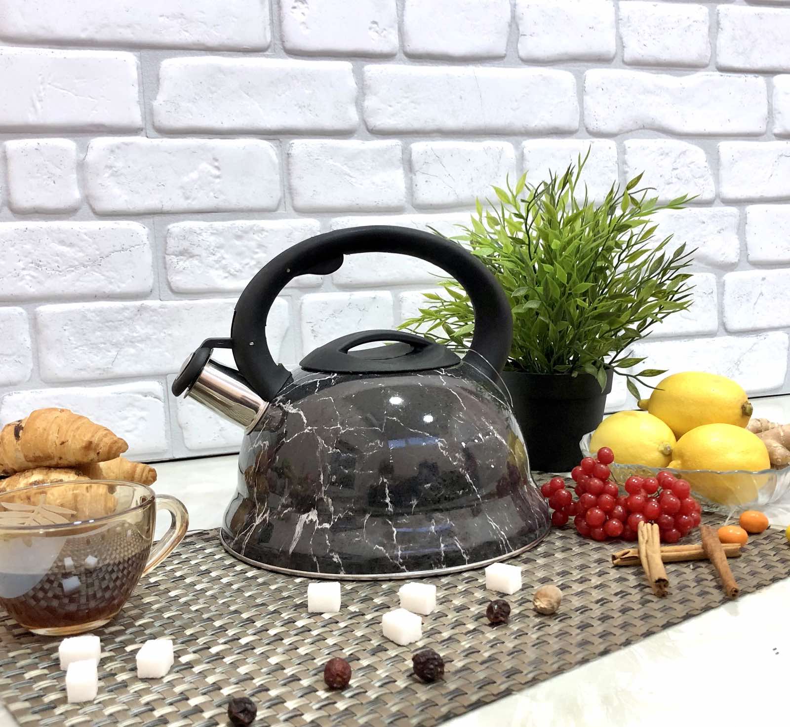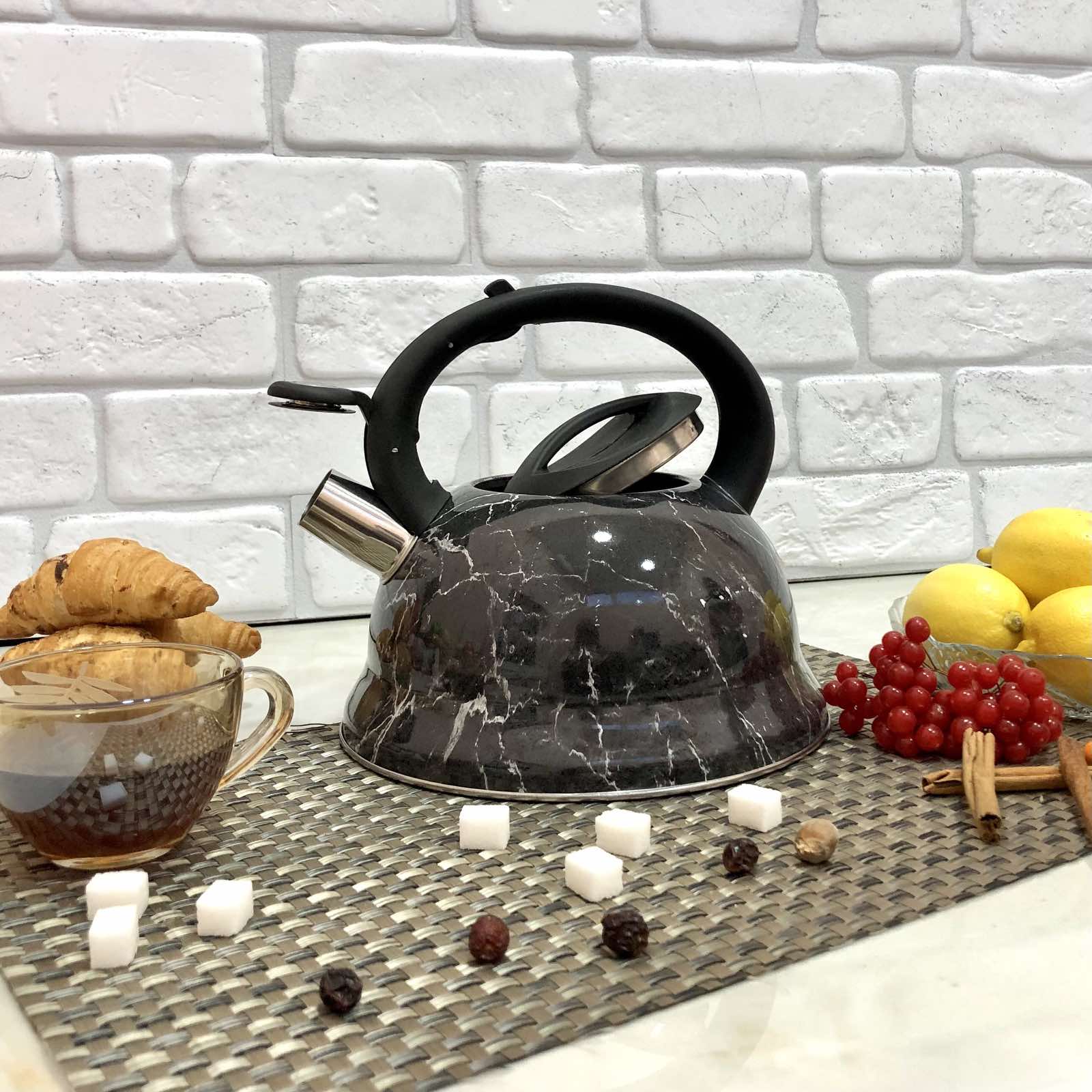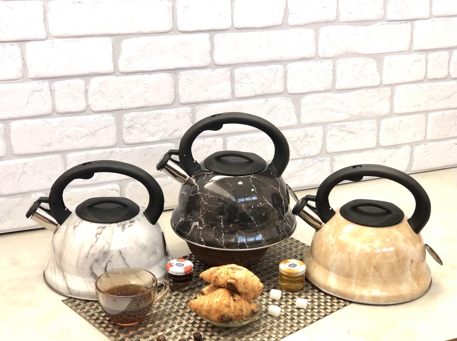 Объем 3 л. Мраморное покрытие, двойное дно. Изготовлен из нержавеющей стали. Корпус чайника прочный и хорошо защищенный от повреждений и царапин. Чайник со свистком, который всегда даст сигнал, что вода закипела. Имеет оригинальный и стильный дизайн. Ручка из бакелита, на которой есть удобная кнопка для открывания клапана на носике. Подходит для всех видов плит, включая индукционную.Характеристики нержавеющего чайника Edenberg EB - 1350
