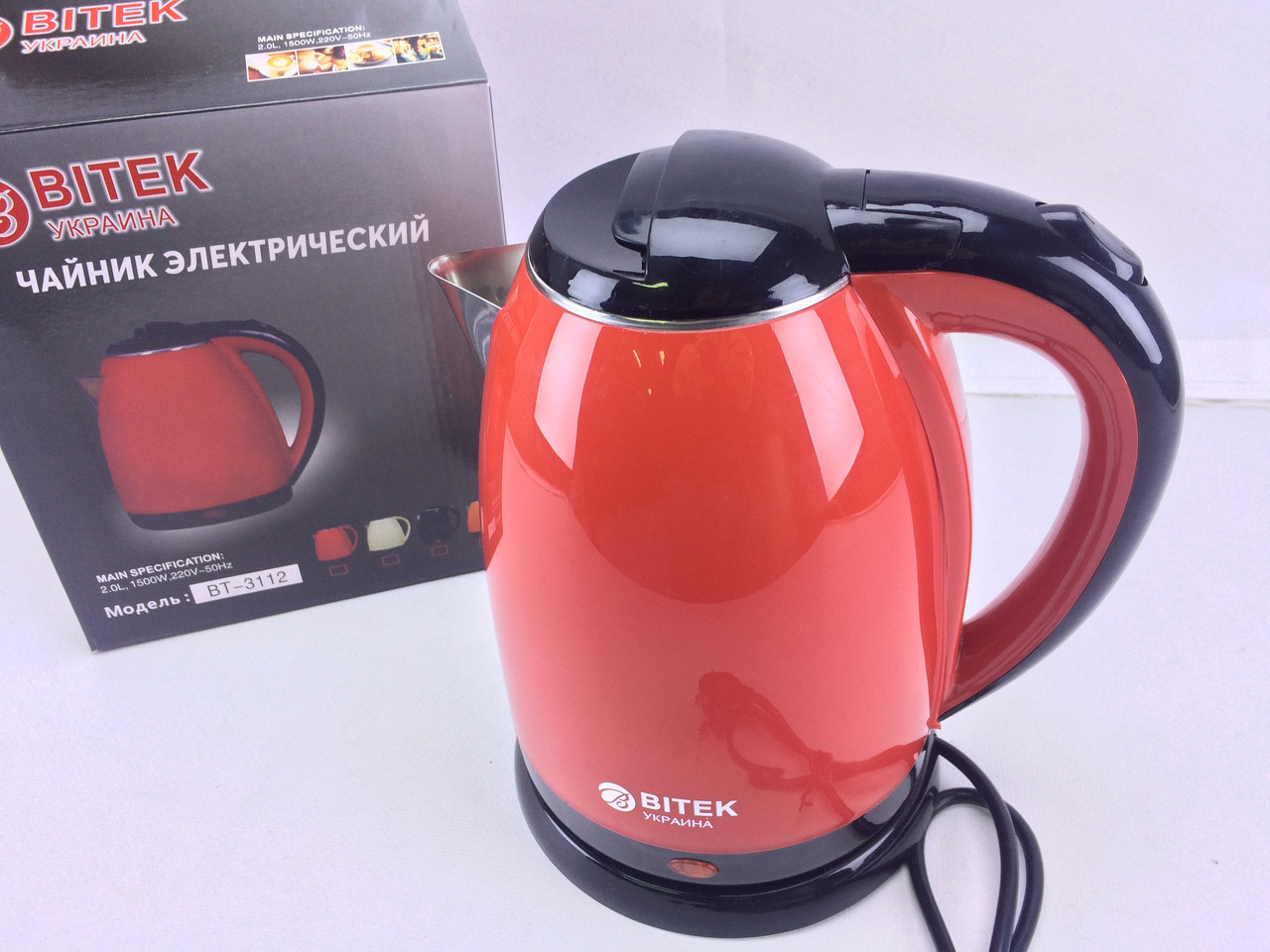 Чайник электрический 3112 объемом 2 л, дисковый. Корпус пластиковый, внутри из нержавеющей стали. 3 цвета - красный, черный, кремовый. Мощность 1500 Вт. Чайник безопасен в работе, так как оснащен функциями защиты от перегрева и автовыключения после закипания.Характеристика электрочайника BITEK BT - 3112