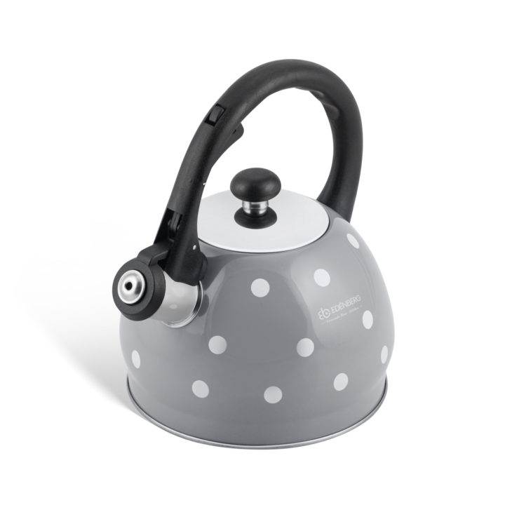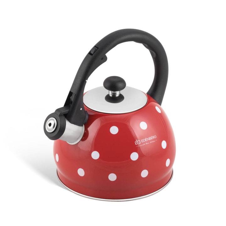 Чайник свистящий изготовлен из нержавеющей стали, с двойным индукционным дном, объем - 2 литра. 4 цвета: красный, желтый, черный и серый. Ручка чайника имеет эргономическую форму и не нагревается при использовании чайника, выполнена из бакелита и дополнительно покрыта мягким силиконом. Свисток чайника из нержавеющей стали откидывается легким нажатием кнопки на ручке. Подходит ко всем современным видам плит, включая индукцию.Особенности чайника со свистком Edenberg EB - 1922