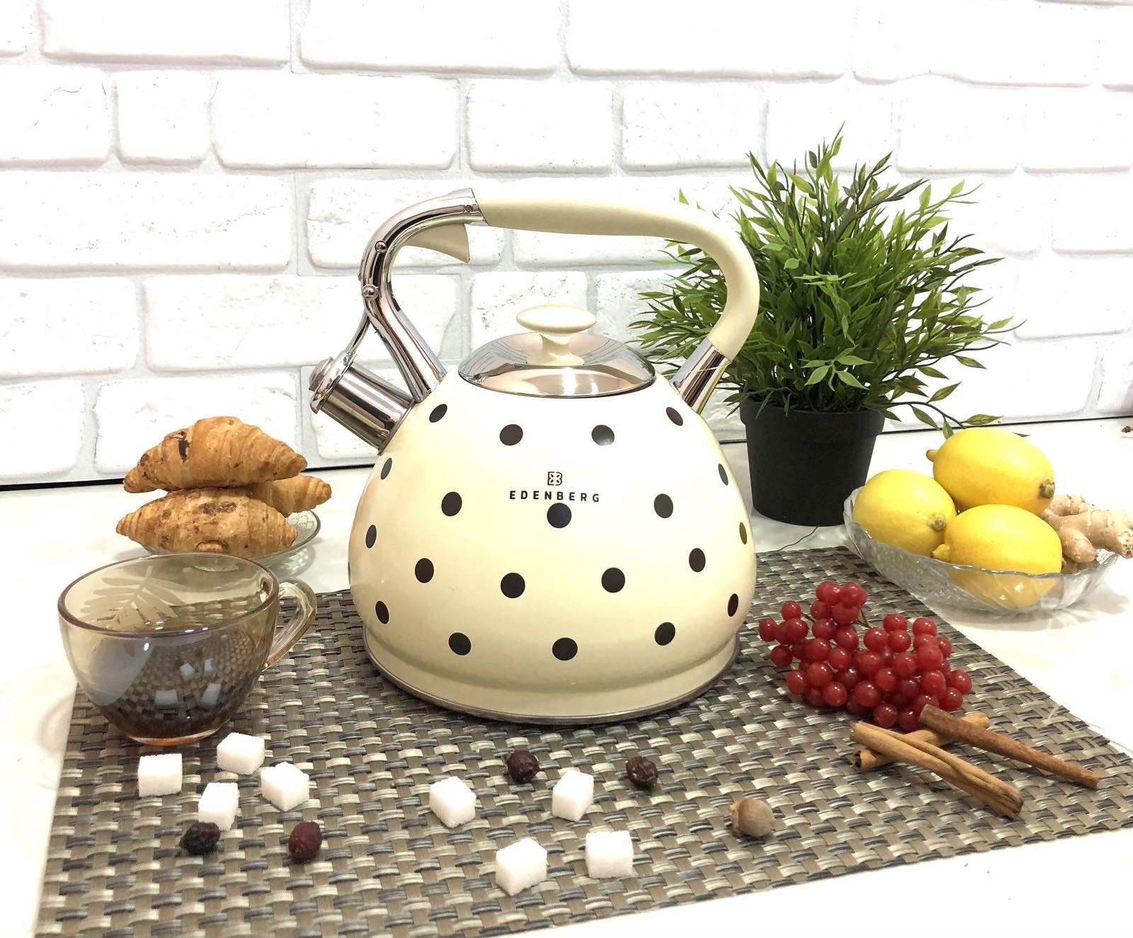 Чайник из нержавеющей стали со свистком объёмом 3 литра и капсульным дном. Но особенность чайника в том, что при нагреве изменяется цвет рисунка, т.е. чёрные полосы изменяются на разноцветные. Когда температура достигает 40 градусов, точки меняют цвет. Ручка не нагревающаяся из бакелита и контрастно выделяется. Корпус стильный и современный, поверхность представлена в белом цвете. После закипания чайник известит о готовности воды с помощью свистка. Также обеспечен быстрый и простой уход за изделием, можно воспользоваться посудомоечной машиной.Особенности чайника для плиты Edenberg EB - 1908