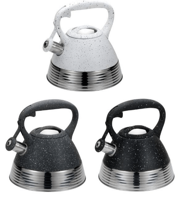 Современный чайник со свистком из нержавеющей стали подходит для всех видов плит. Тяжелое индукционное дно, мраморное покрытие. Удобная ручка не нагревается при использовании, так как выполнена из бакелита. Свисток чайника из нержавеющей стали откидывается легким нажатием кнопки на ручке. Стильный дизайн наружной части в виде небольших ромбов. Чайник в трех цветах - белый, черный, серый.