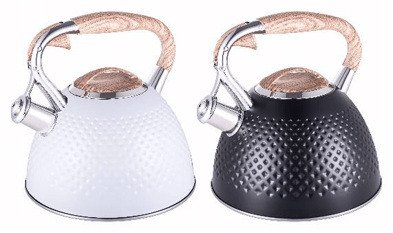Современный чайник со свистком из нержавеющей стали подходит для всех видов плит. Ручка не нагревается при использовании, так как выполнена из бакелита. Свисток чайника из нержавеющей стали откидывается легким нажатием кнопки на ручке. Стильный дизайн наружной части в виде небольших ромбов. Чайник в двух цветах - белый и черный.