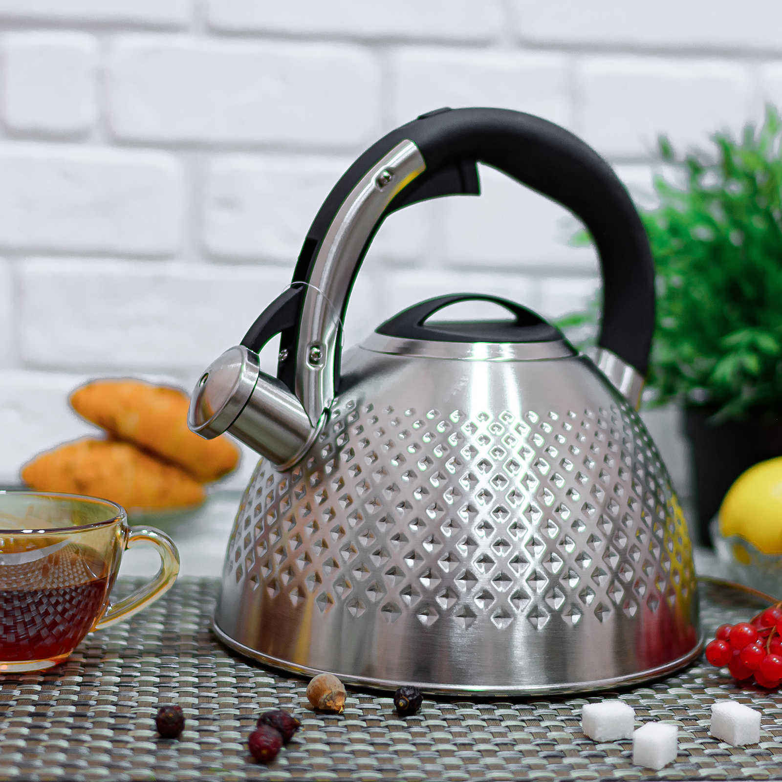 Современный чайник со свистком из нержавеющей стали подходит для всех видов плит. Ручка не нагревается при использовании, так как выполнена из бакелита. Свисток чайника из нержавеющей стали откидывается легким нажатием кнопки на ручке. Стильный дизайн наружной части в виде ромбов, матовая поверхность.