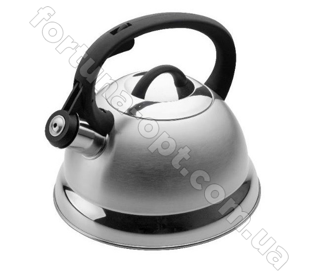 Чайник металлический со свистком на 2,5 л, двойное дно. Матовый блеск корпуса сочетается с зеркальным ободком по низу изделия. Фиксированная мягкая черная ручка из бакелита. Кнопка для открытия и закрытия свистка. Капсульное дно. Дно прогревается за считанные минуты, равномерно распределяя тепло. Корпус чайника из нержавеющей хромированной стали, которая не поддается коррозии и не выделяет вредные вещества.Особенности чайника со свистком Edenberg EB - 1611