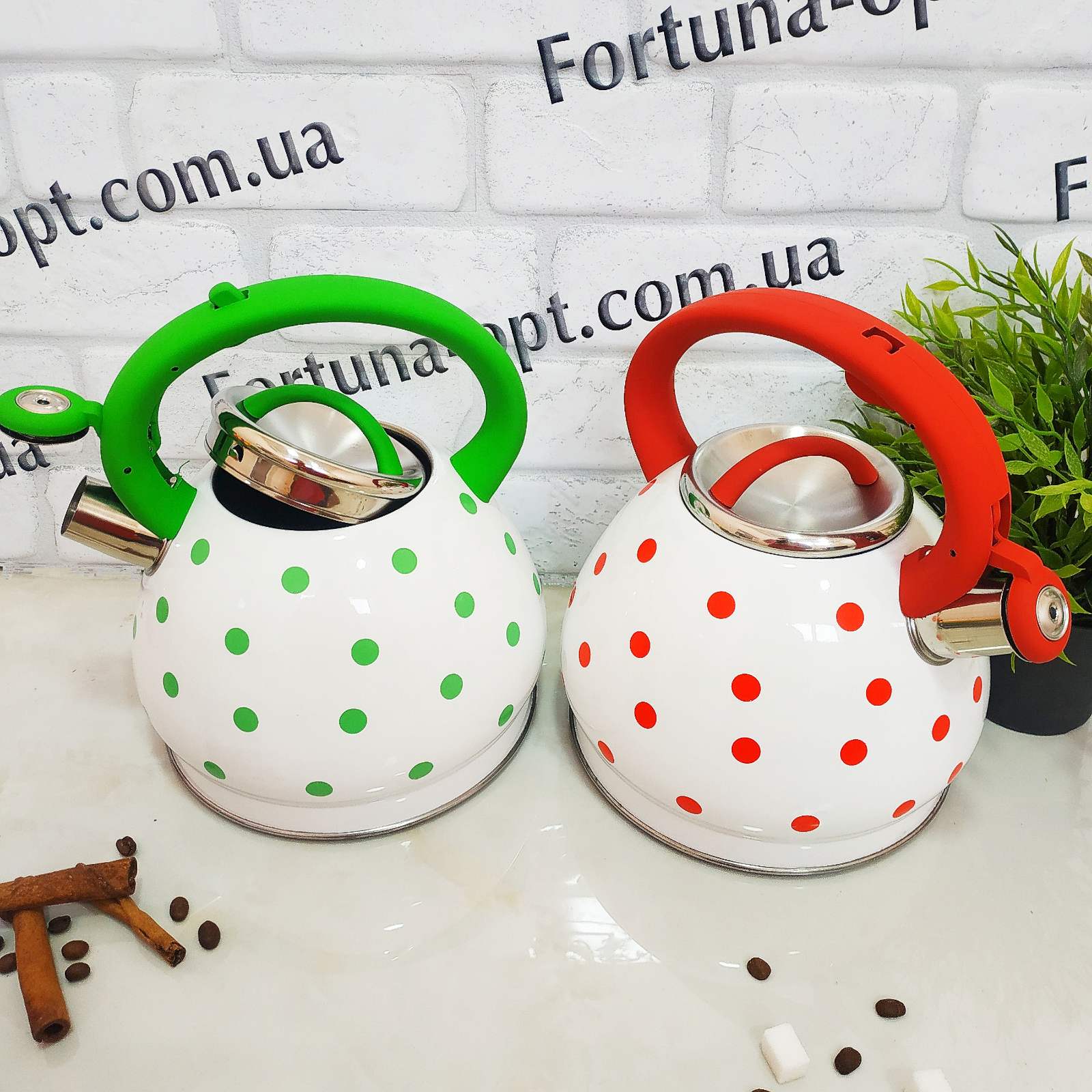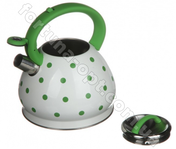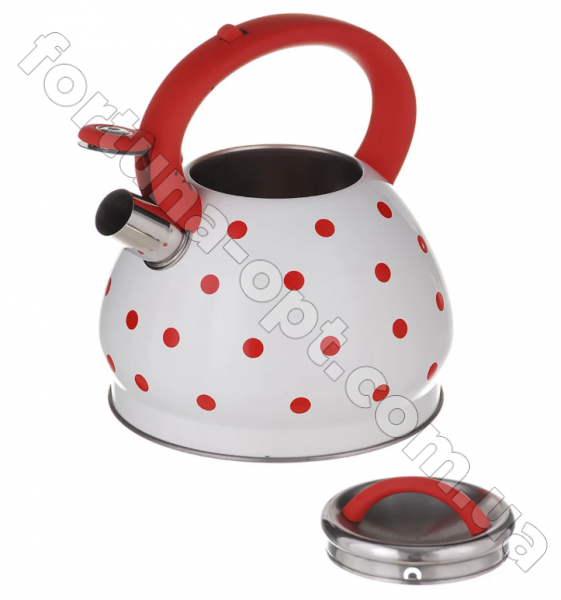 Чайник в горошек изготовлен из окрашенной нержавеющей стали высокого качества. Легко моется. Имеет 3-х слойное термоаккумулирующее капсулированное дно. Также чайник оснащен свистком, который дает понять, что вода закипела. С помощью удобного механизма легко и безопасно открывается свисток. Имеет яркий уникальный дизайн, горошек создает некую современную особенность. Цветная ручка чайника термоустойчивая из бакелита, что предотвращает возможность обжечься. Подходит для использования на плитах всех видов: электрические, керамические, газовые, галогеновые, индукционные.Характеристики чайника в горошек A-Plus - 1390