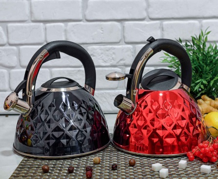 Современный чайник со свистком из нержавеющей стали подходит для всех видов плит. Ручка не нагревается при использовании, так как выполнена из бакелита и дополнительно покрыта мягким силиконом. Свисток чайника из нержавеющей стали откидывается легким нажатием кнопки на ручке. Стильный дизайн наружной части в виде ромбов. 3 цвета: красный, черный, темно-серый.