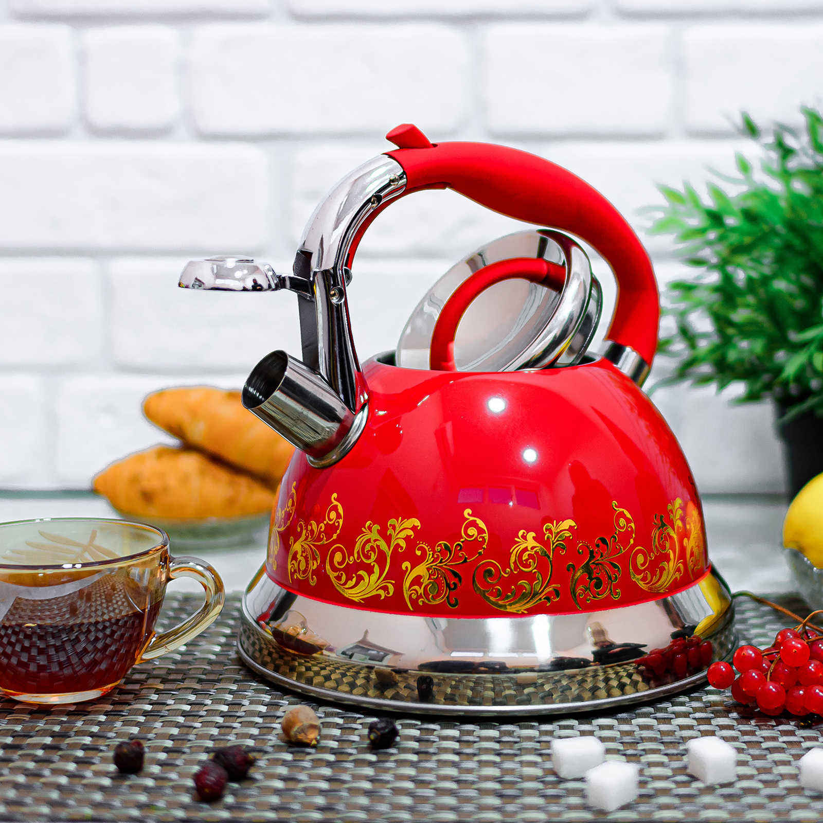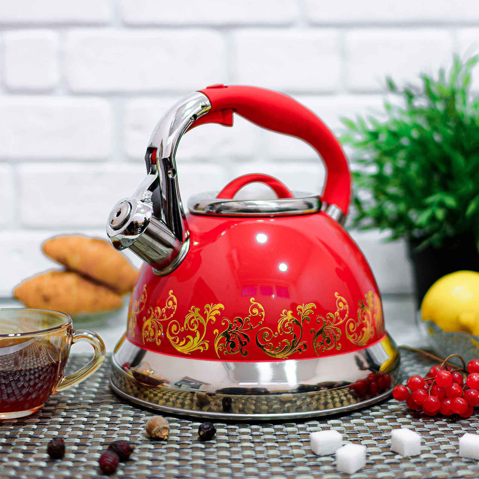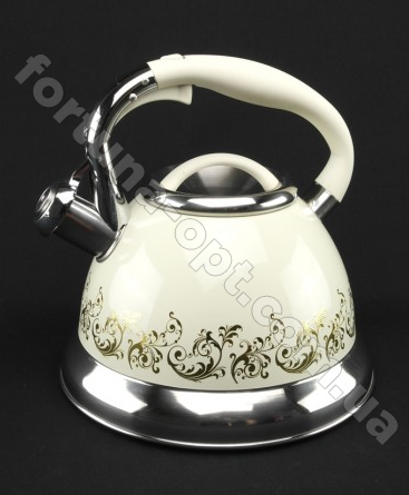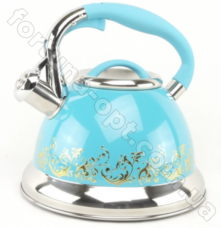 Чайник изготовлен из окрашенной нержавеющей стали высокого качества. Изделие является прочным, долговечным и экологичным. Легко очищается. Благодаря своему капсульному термоаккумулирующему дну быстро нагревает воду. Свисток уведомляет о моменте закипания. Удобный механизм позволяет открывать свисток не касаясь горячих частей. Имеет современный дизайн с уникальным узором. Ручка чайника из нержавеющей стали и частично покрыта бакелитом.Характеристики чайника с узором A-Plus - 1372