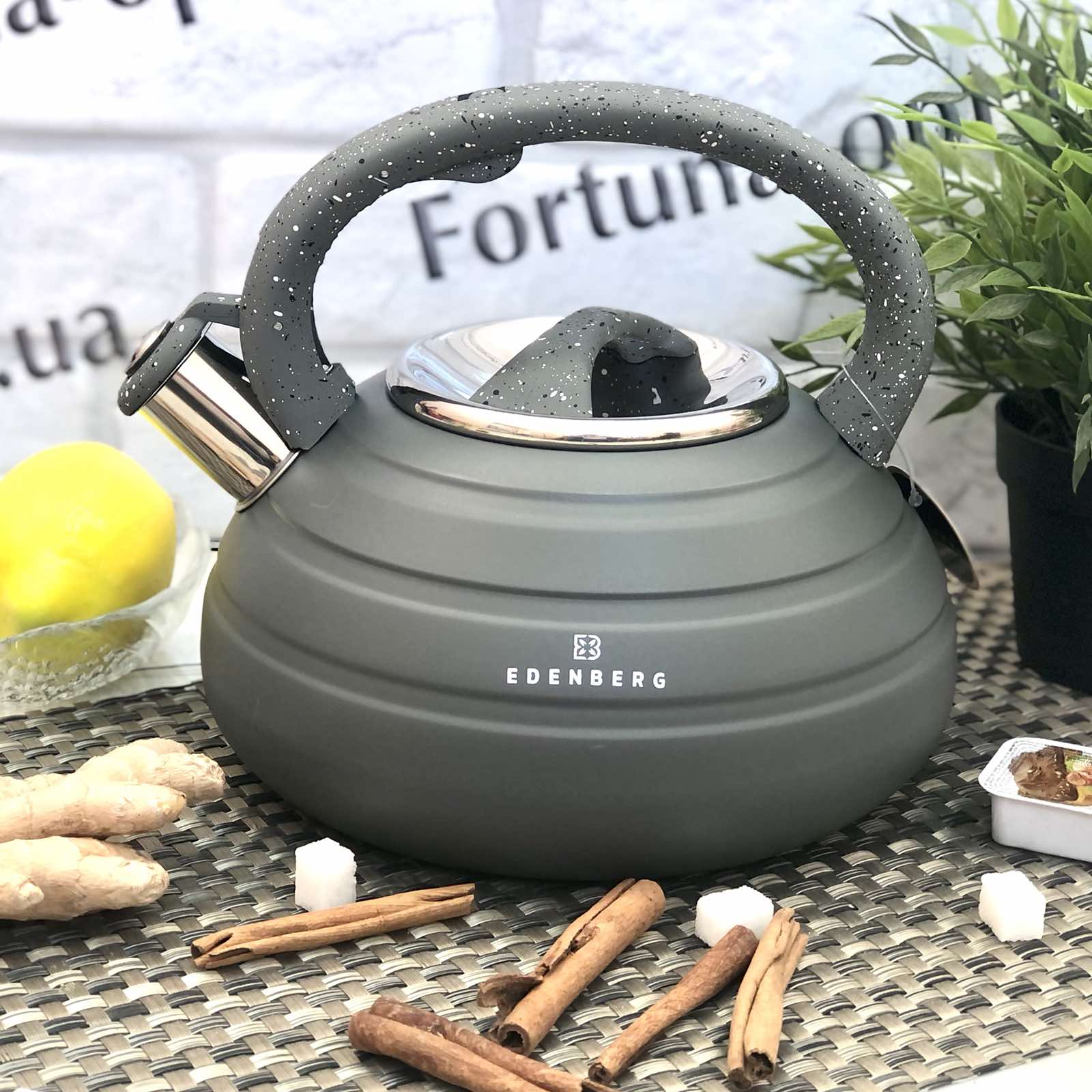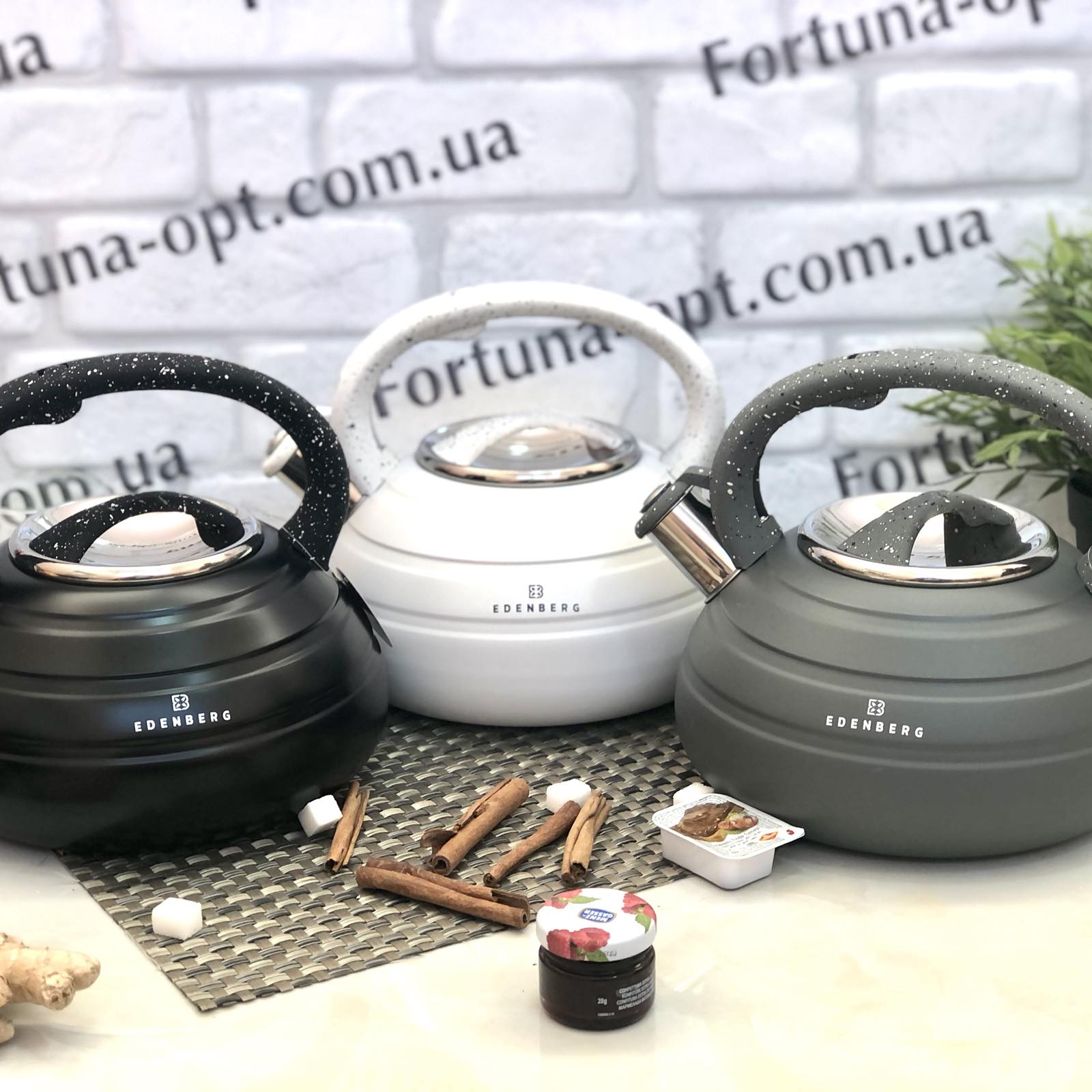 Чайник со свистком из нержавеющей стали объемом 3 литра. 3 цвета: белый, серый, черный. Ручка бакелитовая с мраморной окраской. Подходит для всех видов плит, включая индукционные плиты.Особенности чайника из нержавейки Edenberg EB - 8841