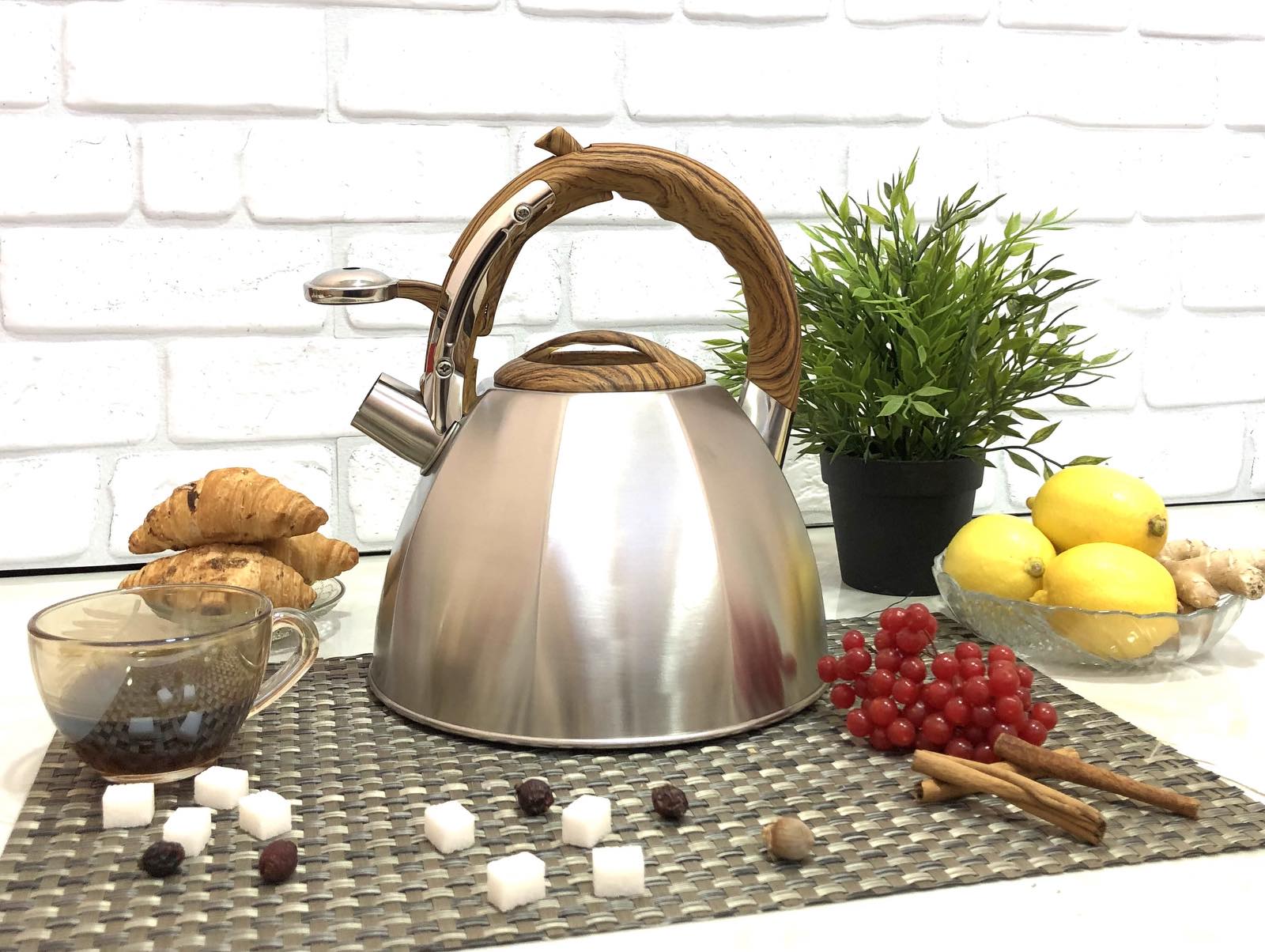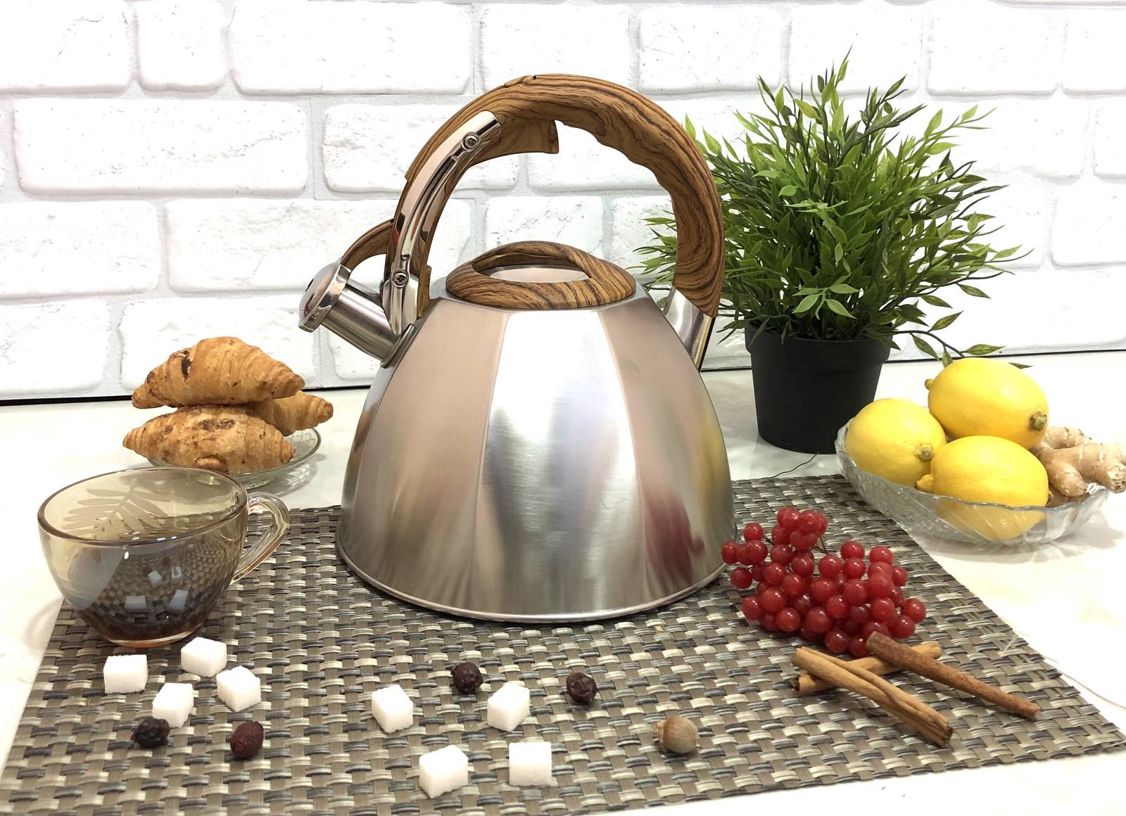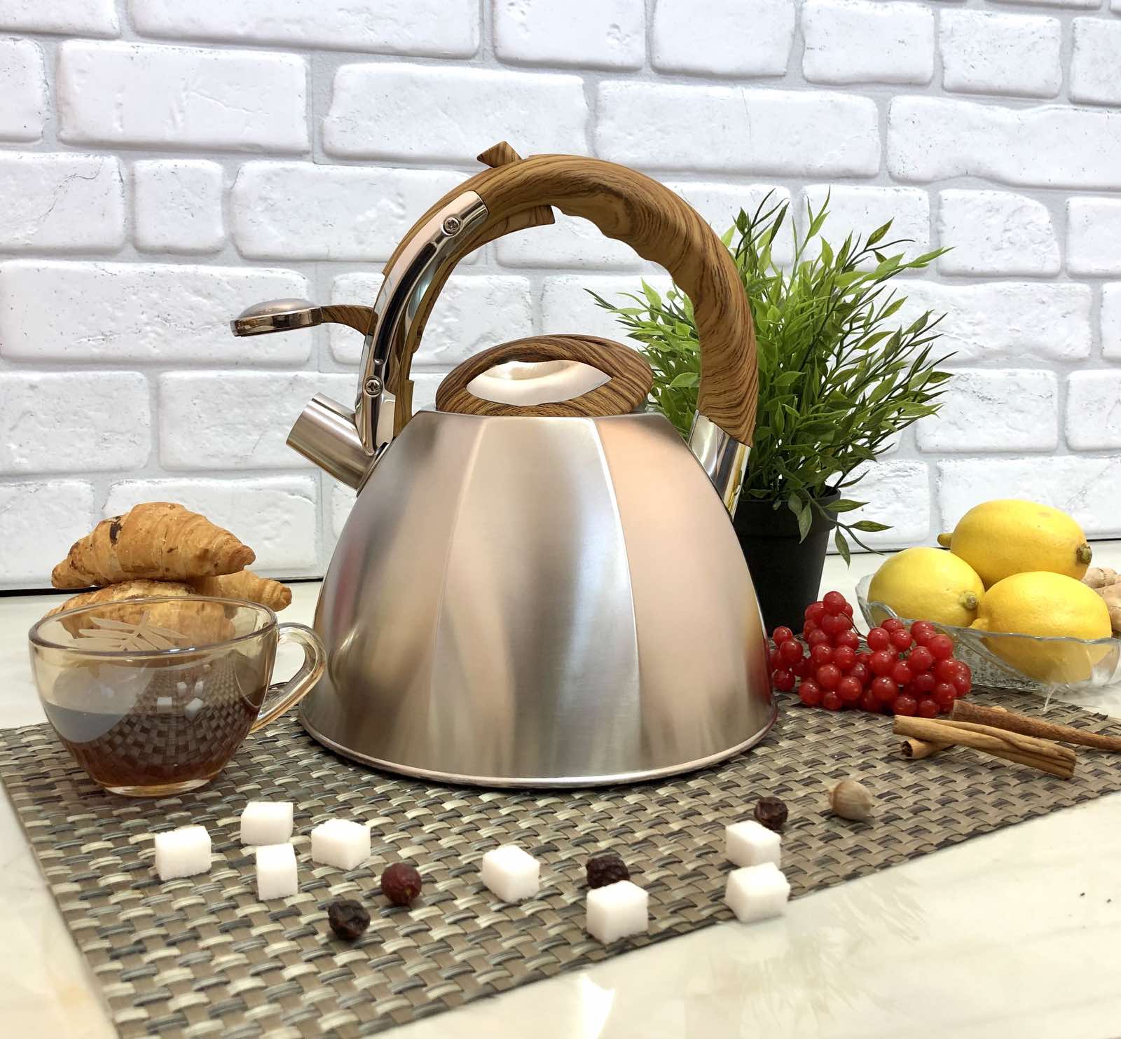 Чайник для плиты изготовлен из нержавеющей стали высокого качества. Легко моется. Чайник оснащен свистком, который дает понять, что вода закипела. С помощью удобного механизма легко и безопасно открывается свисток. Нержавеющий чайник имеет современный дизайн с ручкой в виде ветки дерева. Ручка не нагревающаяся бакелитовая, что предотвращает возможность обжечься. Станет отличным помощником на кухне любой хозяйке. Подходит для использования на плитах всех видов, включая индукционную.Характеристики чайника для плиты A-Plus - 1377