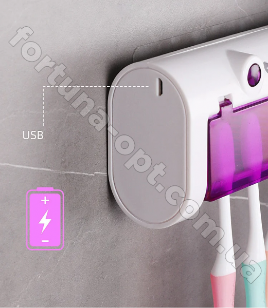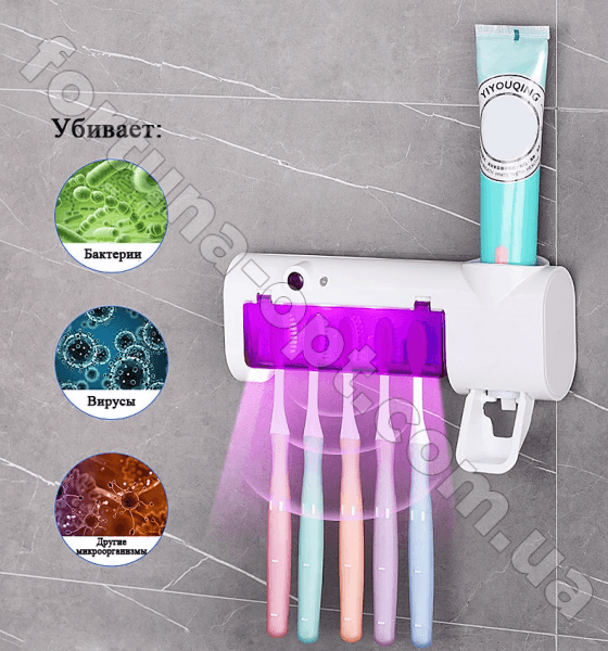 В промежутках между чисткой зубов на зубной щетке остается большое количество микробов, которые не удается удалить обычным промыванием водой, а влажная среда ванной комнаты способствует активному размножению микроорганизмов. Справится с этой проблемой поможет диспенсер для зубной пасты и щеток автоматический. Устройство обладает сразу несколькими функциями: держатель для зубных щеток, ультрафиолетовый стерилизатор (дезинфектор) и механический дозатор зубной пасты. Свечение ультрафиолетовой лампы уничтожает болезнетворные микроорганизмы (до 99.99%), которые накапливаются на щетинках вашей щетки после каждой чистки зубов. Держатель имеет встроенный литиевый аккумулятор 1500 мА, зарядку через USB.