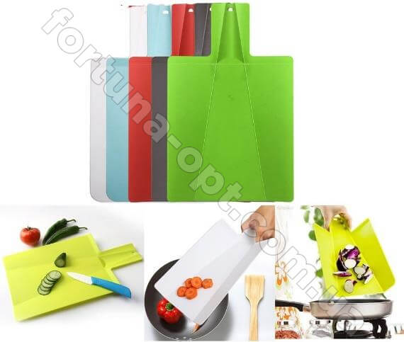 Доска Разделочная складная и гибкая, складывается В "Совок", что позволяет аккуратно перенести нарезанные продукты непосредственно в кастрюлю и любую другую посуду.Ручка рельефная, поэтому вы никогда не будете опасаться того, что доска с продуктом выскользнет из рук. Материал - прочный пищевой пластик яркого цвета. Абсолютно гигиенична, не впитывает посторонние запахи, отлично моется.