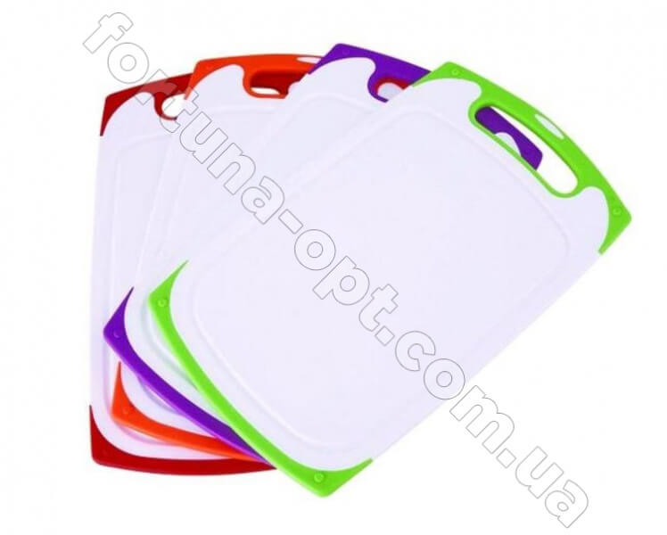 Цвет ободка: фиолетовый, красный, оранжевый, зеленый. Доска разделочная пластиковая размером 25*15 см. Самыми демократичными являются пластиковые доски. Они недорогие, легко ухаживать, устойчивы к температурам, возможность использования обеих сторон, запахи практически не впитывают, имеют отверстие для подвешивания. Если бы нужно было решить какие разделочные доски лучше- деревянные или пластиковые, то предпочтенье бы отдали двоим. Они одинаково хороши, но каждая по своему, поэтому и та, и та достойна поселиться на вашей кухне. По частоте использования с доской сравняться, пожалуй, могут только ножи. Купить доску деревянную, купить доска разделочная, доска деревянная, доска буковая, доска пластик,доска стеклянная вы всегда сможете приобрести у нас на сайте: fortuna-opt.com.ua по самым низким ценам.