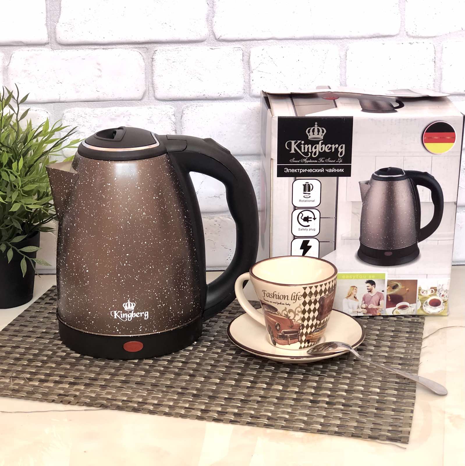 Удивит своей функциональностью и оригинальным дизайном. Электрочайник надежно и быстро справляется со своей основной задачей. Нагревательный элемент выполнен из нержавеющей стали и имеет закрытый тип. Данная модель электрочайника может вращаться на 360 градусов на своем цоколе и корпус устойчив к воздействию высоких температур. Корпус изготовлен из нержавеющей стали со специальным мраморным покрытием высокого качества. Модель чайника имеет удобную и обтекаемую форму ручки.Характеристика чайника Kingberg 2040