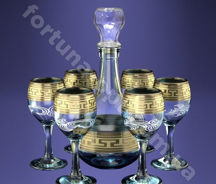 Набор графин 0,5л с 6 рюмками 60мл 03-500/134 с рисунком "Греческий узор". Производитель: Гусь хрустальный.Технология: гравировка, напыление под золото. Подарочная упаковка. Бокалы, фужеры,рюмки вы всегда сможете приобрести у нас на сайте: fortuna-opt.com.ua по самым низким ценам производителя.