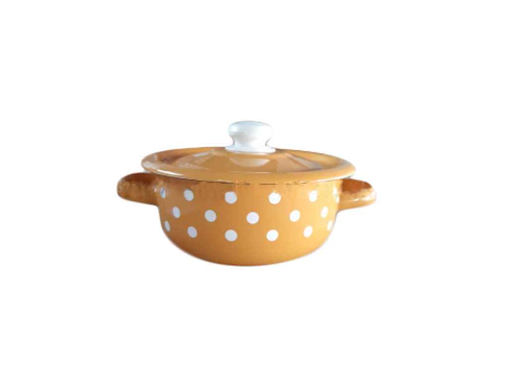 Кастрюля эмалированная "Горчичная полька" имеет компактные размеры: диаметр - 16 см, высота - 7 см, толщина стенок - 1,2 мм. Подходит для использования на газовых, электрических и керамических плитах.