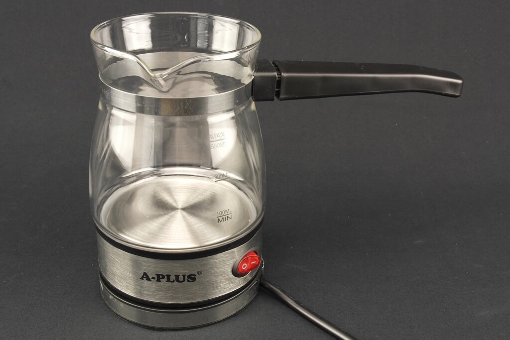 Кофе в электрической кофеварке готовится намного быстрее. Всего 1 - 2 минуты и ароматный напиток готов. Вы можете брать электротурку с собой в поездки и путешествия. На кухне также этот аксессуар не займет много места. Не нужно выставлять таймер или выбирать программы. Никаких функций кроме включения и выключения нет. Чтобы сварить ароматный напиток, вам нужно насыпать кофе, залить его водой и включить электротурку в сеть. Для очистки достаточно просто протереть кофеварку влажной губкой. Вы можете использовать электрокофеварку в комнате, где нет плиты, например общежитие.Особенности кофеварки из стекла и нержавеющей стали A-Plus - 2125