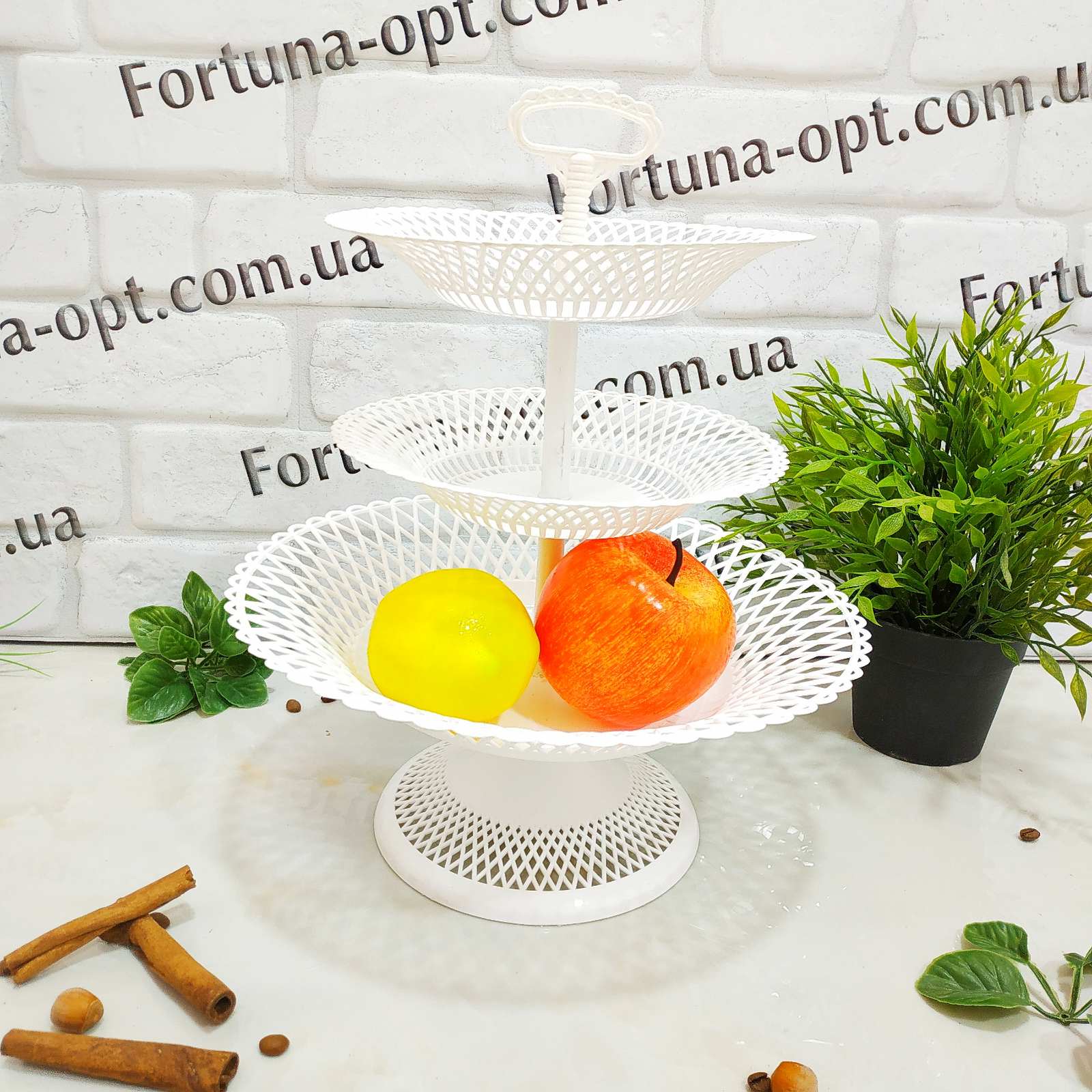 Фруктовница пластиковая состоит из трех ярусов. Верхний и средний ярус имеет диаметр 19 см, нижний ярус 28 см.Характеристики трехярусной фруктовницы - 5058
