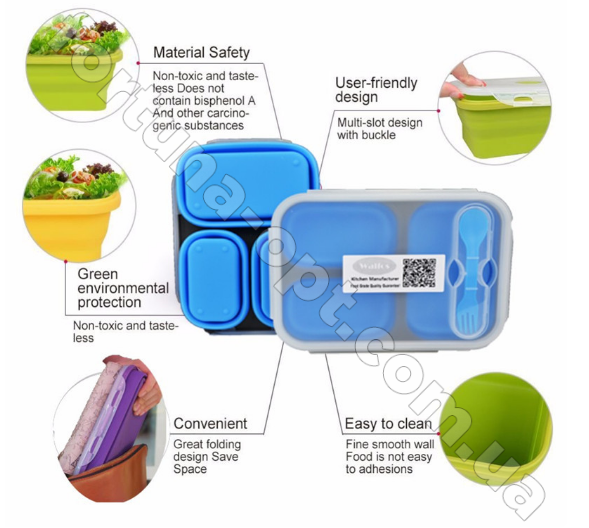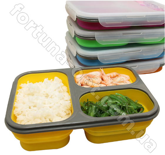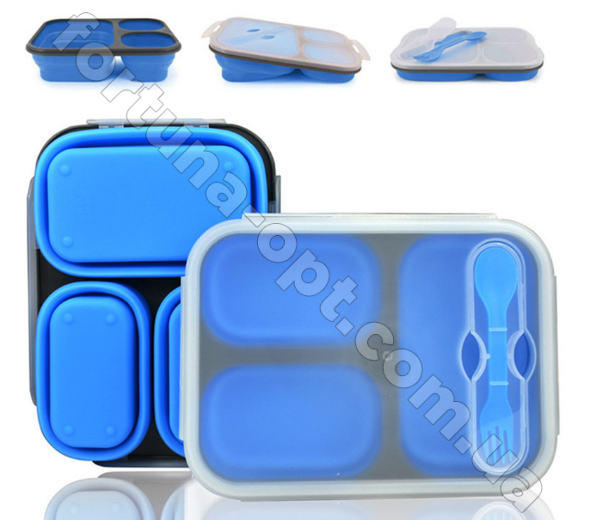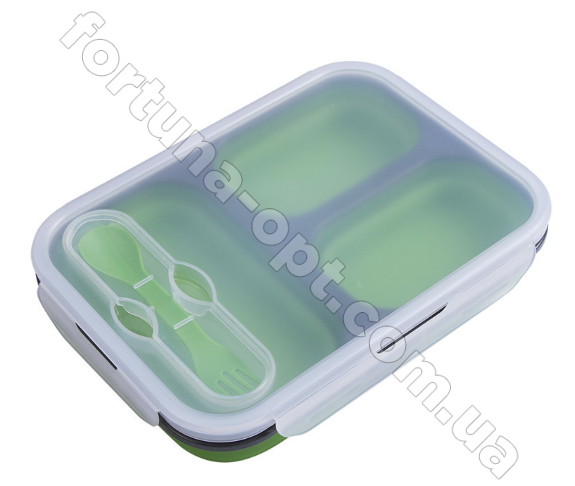 Удобный и практичный ланч-бокс небольшого размера. Он легко складывается, благодаря чему прост в транспортировке. Ёмкость для еды разделена на три части – специально для хранения разных блюд. Изделие выполнено из высококачественного и безопасного для здоровья материала. Силикон не выделяет вредные вещества даже при высокой температуре и является экологически чистым. Легко очищается после использования.