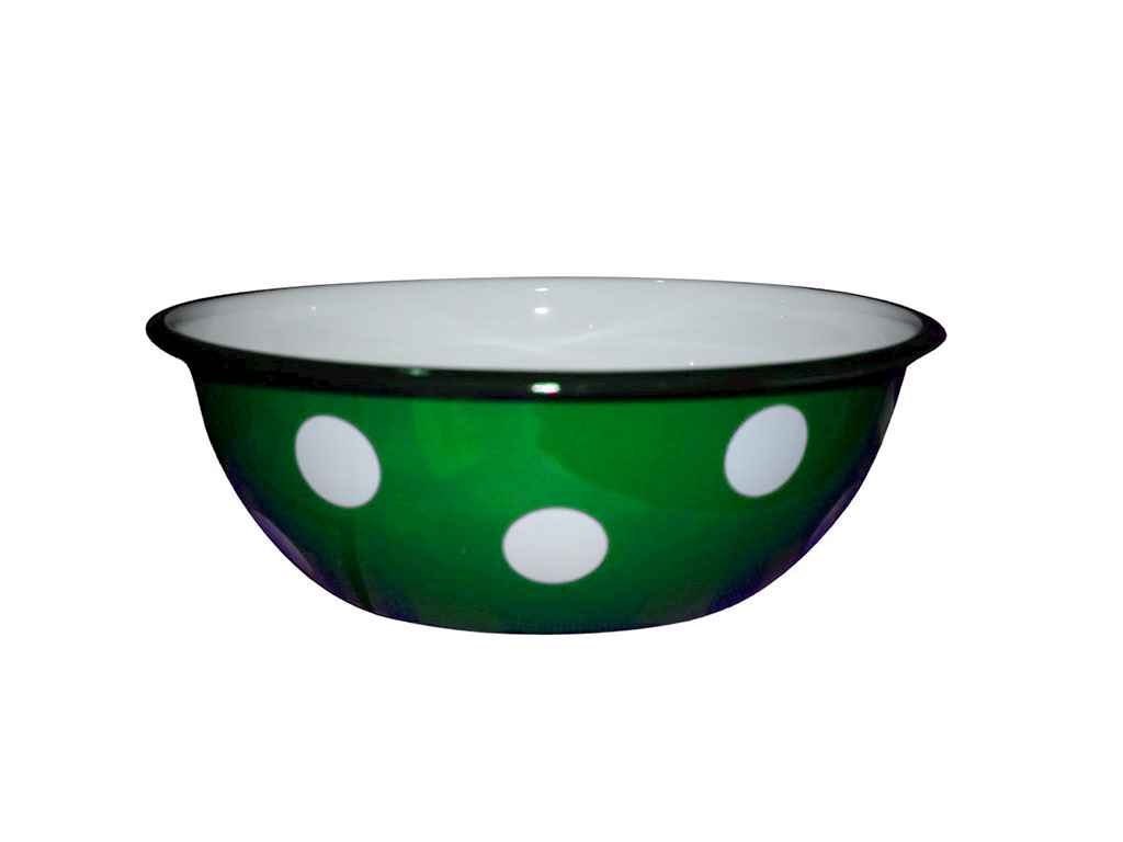 Миска эмалированная "Белый горох" (зеленая) объемом 2,5 л. Внутренний диаметр - 23 см, внешний диаметр - 24,5 см. Миска изготовлена из специальных стальных листов и покрыта двумя слоями жаропрочной эмали.