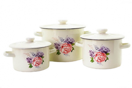 Набор 822 "Розовый пион" состоит из трех эмалированных кастрюль цилиндрической формы. Объем кастрюль 2 л, 3 л, 5,5 л. Набор можно использовать на электрической, газовой, стеклокерамической и индукционной кухонной плите.Характеристики набора кастрюль из эмали "822" Розовый пион