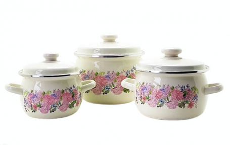 Набор 928 "Анабель молочная" состоит из трех эмалированных кастрюль сферической формы. Объем кастрюль 1,5 л, 2,5 л, 3,5 л. Набор можно использовать на газовой, электрической, стеклокерамической и индукционной кухонной плите.Характеристики набора кастрюль из эмали "928" Анабель молочная