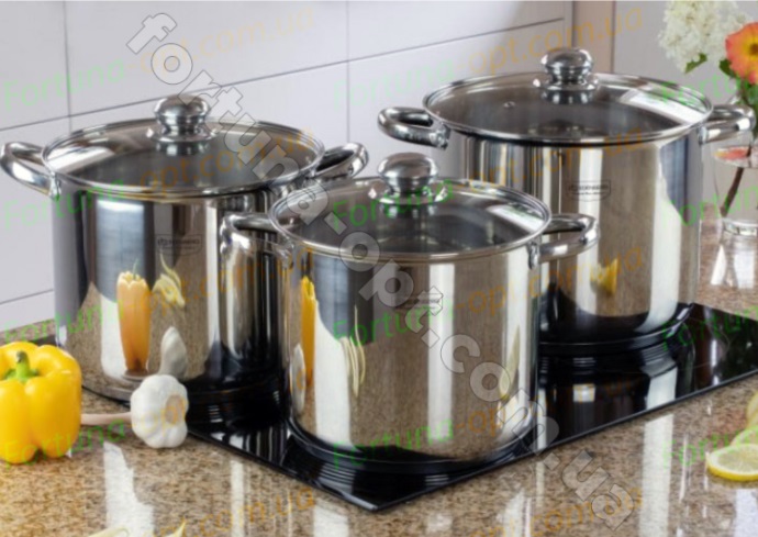 Это качественный набор посуды, благодаря которому Вы сможете приготовить огромное количество пищи качественно и экономно. Набор изготовлен из прочной и высококачественной нержавеющей стали. Этот материал стойкий к коррозии и не влияет на вкус еды. В наборе есть стеклянные крышки с отверстием для выходящего пара. Дно прогревается за считанные минуты и равномерно распределяет тепло по поверхности, поэтому пища готовится быстро и вкусно. Можно использовать на индукционных плитах.