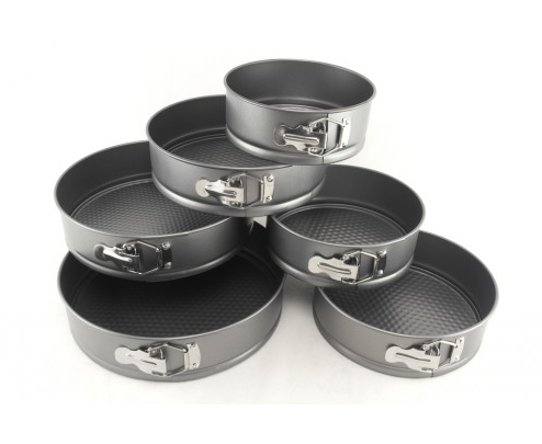 Набор форм для выпечки торта 1129 состоит из шести форм:(Диаметр -18 см, 20 см, 22 см, 24 см, 26 см, 28 см, высота - 7,5см ). Форма для торта 1129 изготовлена из штампованного алюминия с антипригарным покрытием, что обеспечивает внутренней поверхности формы для выпечки 1129 превосходные антипригарные свойства. Комфортным дополнением формы для торта 1129 является разъемная конструкция. Одним движением клипса разделяет стенку и дно формы, что даёт возможность извлечь готовую выпечку без повреждений.
