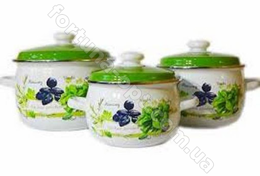 Набор кастрюль 926 Зеленый фреш. Состав: кастрюли сферические с н/ж ободком и эмалированной крышкой 2,5л, 3,5л, 5л. Наборы эмалированных кастрюль,эмалированные миски, эмалированные кружки, эмалированные ковши, эмалированные кастрюли вы всегда можете приобрести у нас на сайте fortuna-opt.com.ua по самым низким ценам.