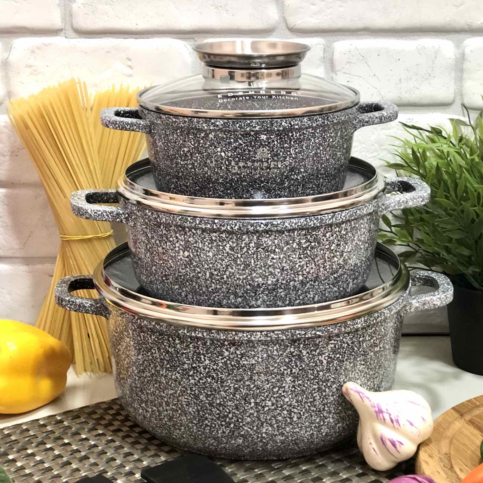 Этот качественный набор состоит из 3 кастрюль. Изготовлен из алюминия, который не влияет на вкус пищи и не выделяет вредные вещества даже при высокой температуре, пища не прилипает к стенкам и дну. Обе стороны изделия имеют мраморное покрытие, индукционное дно, стеклянные крышки с пароотводом и кнопкой для добавления растительного или оливкового масла, подходит для всех кухонных видов плит, включая индукционную.Особенности набора кастрюль Edenberg EB - 8020