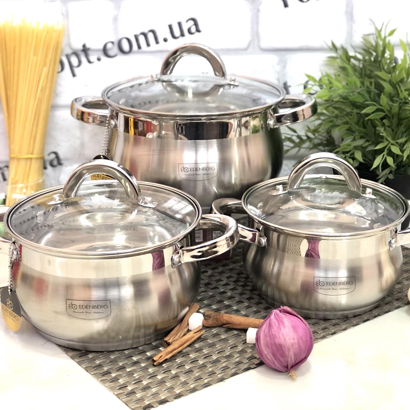 Набор посуды яблочной формы является очень стильным, современным и популярным дизайном кастрюль на сегодняшний день. Форма яблока неспроста - тепло быстро и равномерно распределяется по всей поверхности кастрюли, при этом ручки не нагреваются, что облегчает процесс готовки. Edenberg EB - 3716 состоит из трёх кастрюль разного объёма. Посуда долговечная, так как выполнена из качественной нержавеющей стали. После эксплуатации набор легко очищается от остатков пищи.