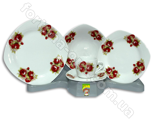 Cостав:подставная тарелка - 6 штук,диаметр - 26,5 см. Суповая тарелка - 6 штук,диаметр - 20,5 см.Десертная тарелка - 6 штук,диаметр -19 см.Чашки (220 мл.) - 6 штук,блюдца - 6 штук.