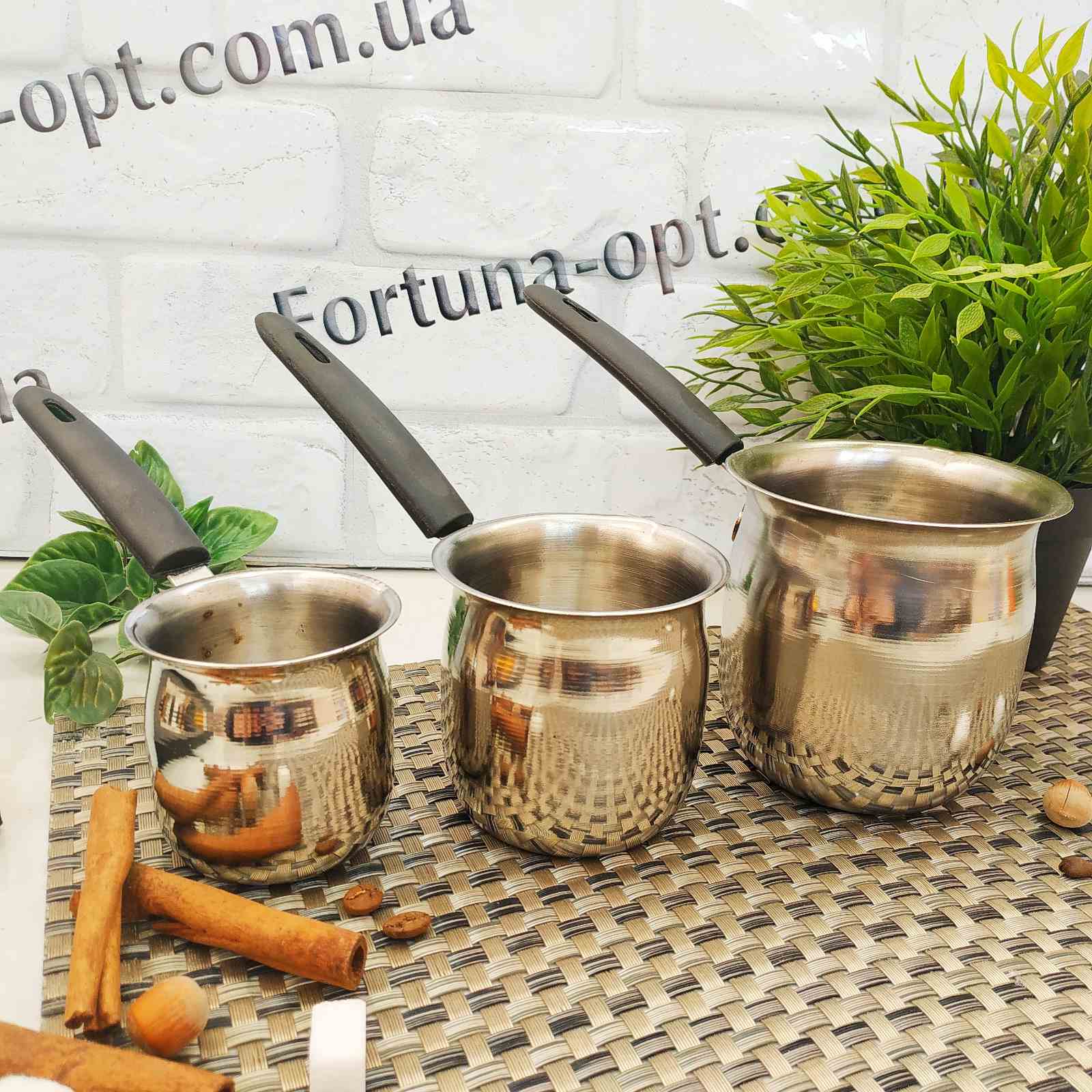 Набор турок (3 шт.) из нержавеющей стали объемом 180 мл, 360 мл и 720 мл. Нержавеющая сталь не вступает в реакцию с напитком во время приготовления, а значит не меняет ее вкус и запах. Кофеварка подходит для заваривания кофе, чая или различных трав или подогрева жидкостей. Такая посуда прочная и долговечная. Легко очищается даже в прохладной воде. Многофункциональный набор имеет современный дизайн и занимает минимум места на кухне.Особенности набора турок нержавейка A-Plus - 0780