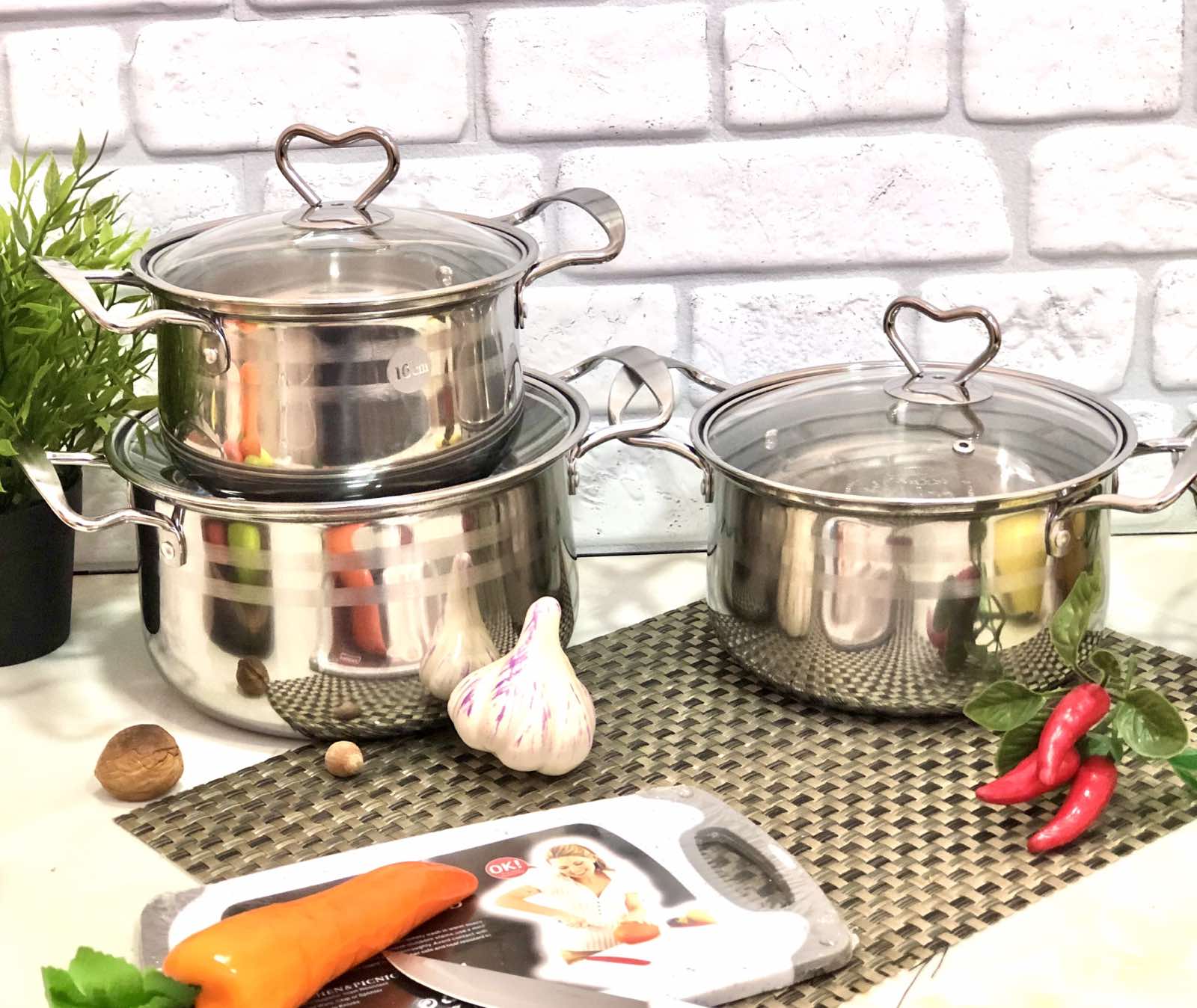 Данный набор посуды состоит из трёх кастрюль разного объёма. Сама же посуда выполнена из прочной и высококачественной нержавеющей стали, которая отличается хорошими защитными качествами – корпус не царапается и не поддаётся деформации, коррозии. В наборе есть крышки с отверстиями для выхода пара, они выполнены из жаростойкого стекла. Пятислойное дно прогревается за считанные минуты и равномерно распределяет тепло. Главной особенностью набора является то, что кастрюли можно использовать на индукционных плитах.