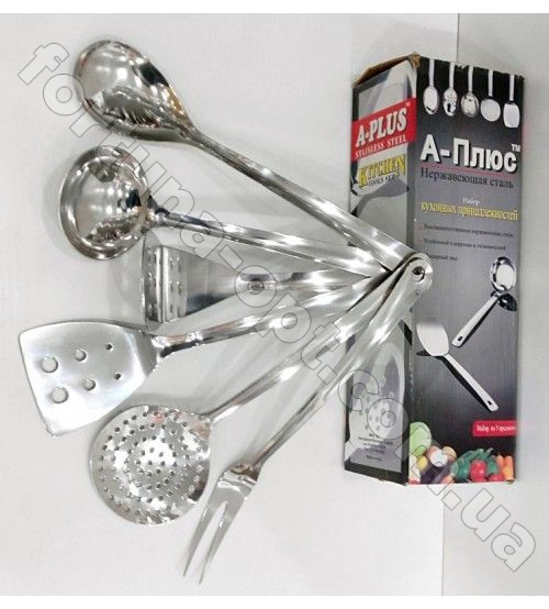 Набор кухонный из 5 предметов. Нержавеющая сталь.Состав: лопатка, ложка кухонная, ложка кухонная с дырками, половник, шумовка, крючки.