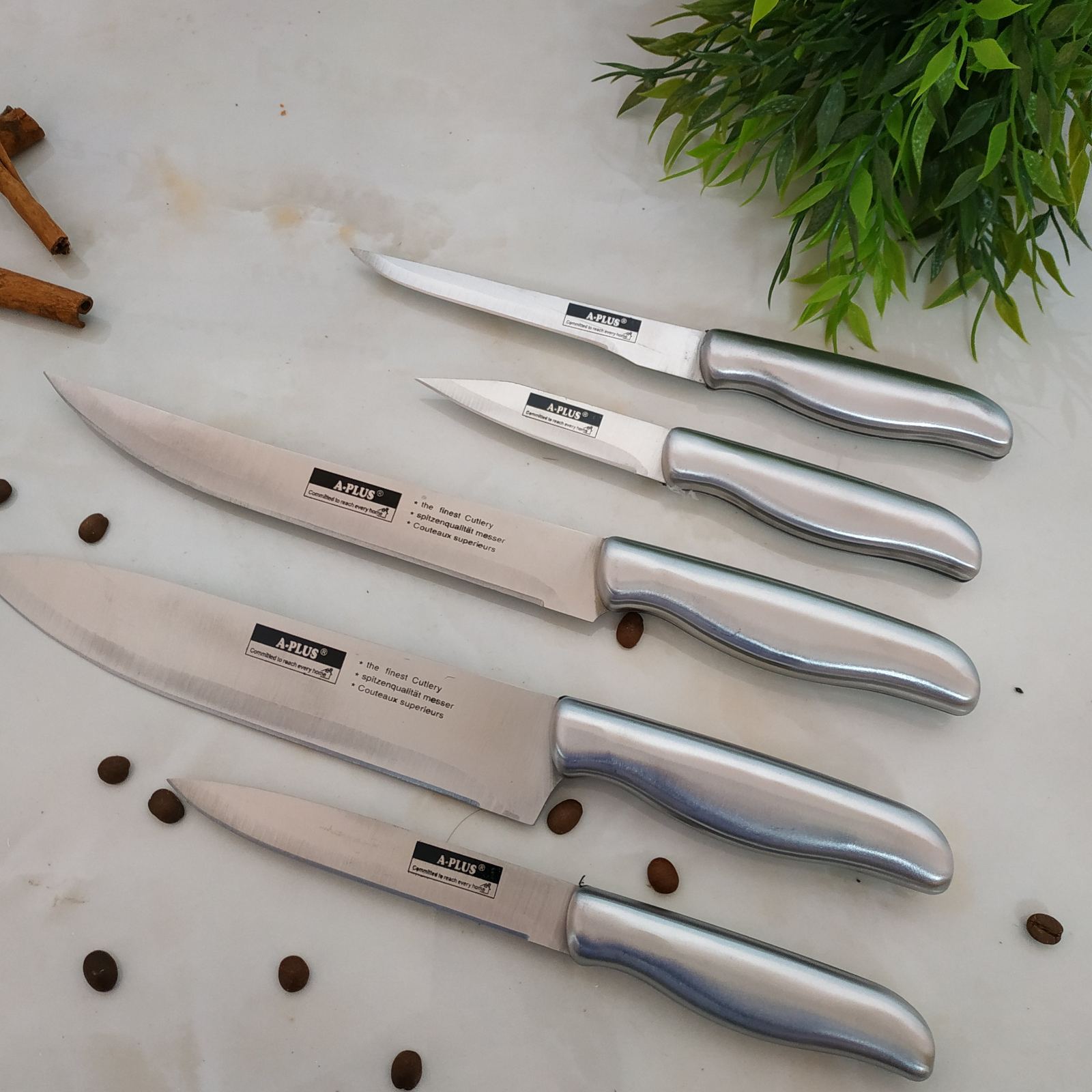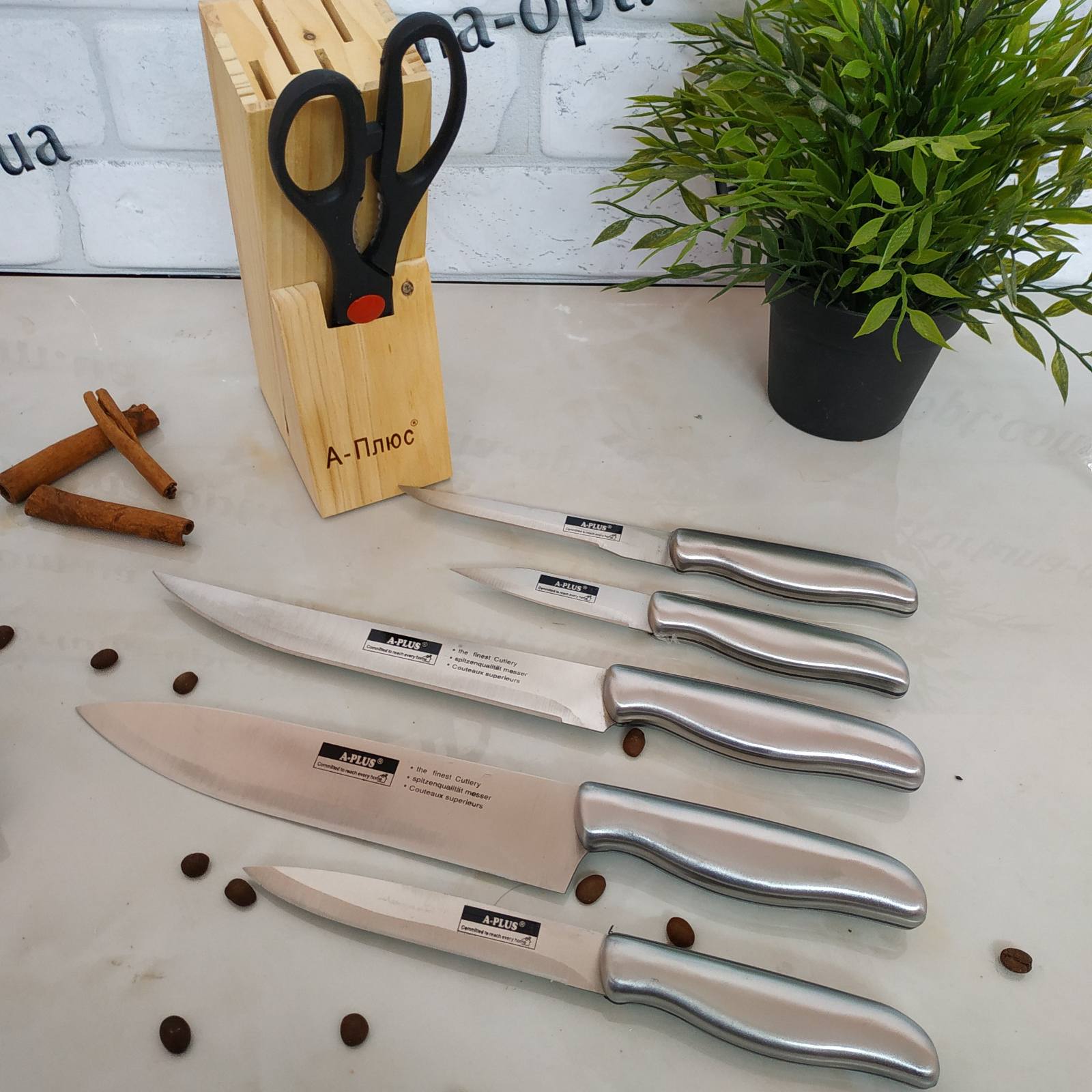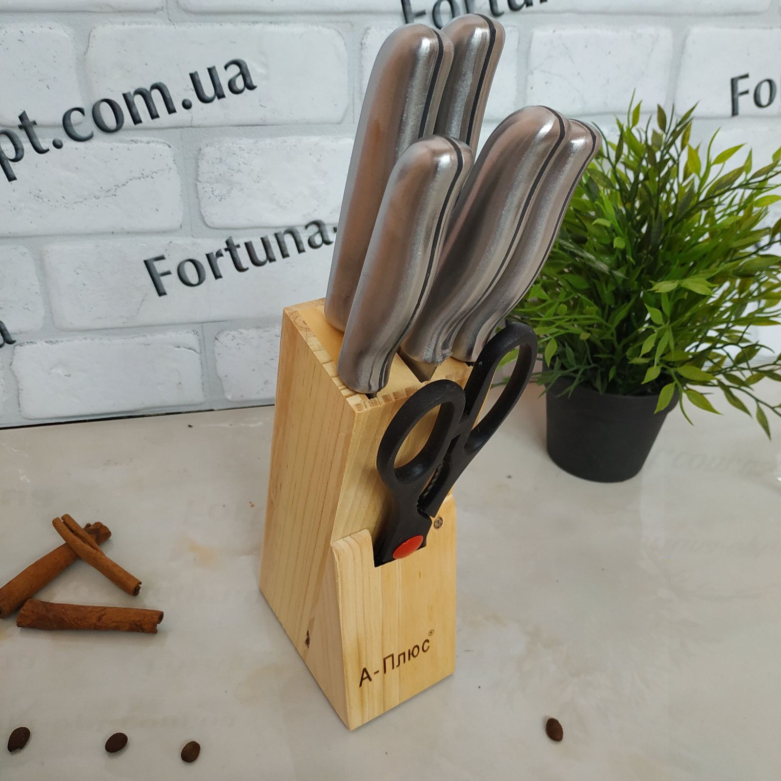 Набор ножей (7 предметов) с металлическими ручками: Нож кухонный - 5 шт. ножницы кухонные - 1 шт, подставка деревянная - 1 шт. Если вы ищете хороший Набор ножей в дешевом ценовом сегменте, то набор ножей 1006 ТМ А-Плюс как раз то, что вам необходимо. Компания Фортуна предлагает товары ТМ А-Плюс оптом, посуда А-Плюс оптом на самых выгодных условиях в ее полном ассортименте: решетки для гриля А-Плюс, ведра нержавеющие А-Плюс, противни для выпечки А-Плюс, формы для выпечки А-Плюс, наборы кастрюль А-Плюс, термоса А-Плюс, сковородки А-Плюс, чайники А-Плюс, дуршлаги А-Плюс, миски нержавеющие А-Плюс, сита А-Плюс, электротовары А-Плюс на сайте: Fortuna-opt.dp.ua
