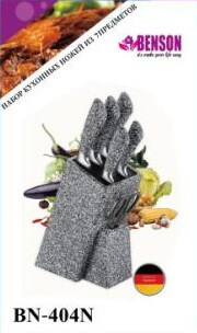Набор ножей Benson состоит из 7 предметов, в которые входят 5 ножей и ножницы на подставке. Данный набор ножей пригодится на любой кухне. Ножи изготовлены из качественной нержавеющей стали. Набор Benson 404 станет настоящей находкой для Вас! При этом, для разных задач используются различные виды ножей. Прослужит Вам долго и качественно!Комплектация набора Benson 404: