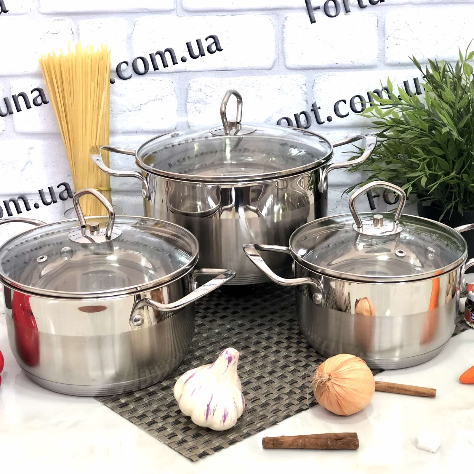 Набор кастрюль A-Plus - 1294 изготовлен из нержавеющей стали, обладающей исключительными антикоррозионными свойствами, благодаря чему кастрюли ТМ А-Плюс не портятся долго, сохраняя прекрасный первоначальный внешний вид. Кастрюли с утолщенным, многослойным дном капсульного типа. Клепанные не нагревающиеся ручки из нержавеющей стали серебряного цвета. Набор посуды подходит для всех источников тепла, включая индукционные плиты. Прозрачные крышки – термостойкое стекло с отверстием для выхода пара. Можно мыть в посудомоечной машине. Легко чистится.Особенности набора посуды A-Plus - 1294