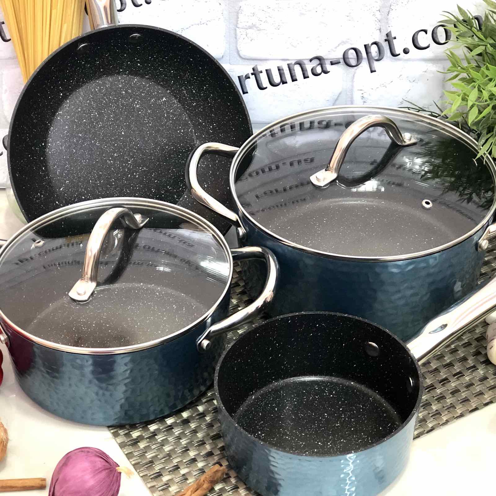 На каждой кухне должен быть удобный набор кастрюль для готовки вкусных блюд. Данный набор A-Plus - 3015 отличается стильным, оригинальным дизайном. Он включает в себя 2 кастрюли разного литража, ковш и сковороду. Изделия выполнены из высококачественного и прочного материала – литого алюминия с с мраморным покрытием, которая является экологически чистой и безопасной для здоровья. Посуда легко очищается от остатков пищи. Изделия имеют нержавеющие ручки с клепочным соединением.