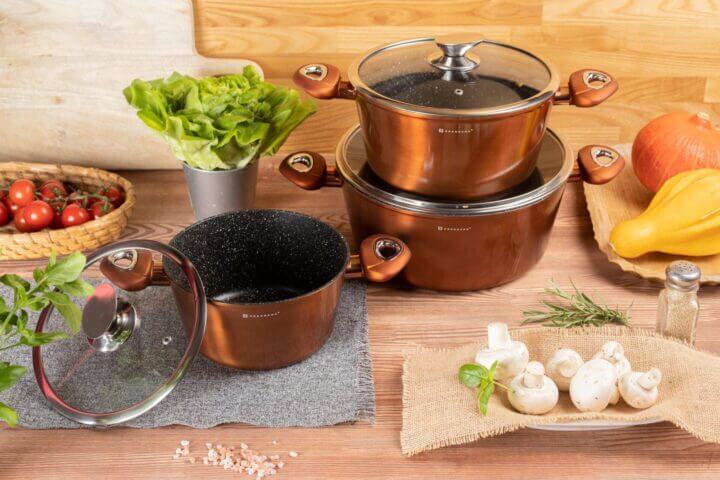 Набор посуды Edenberg EB - 7422 состоит из 8 предметов - трех кастрюль, двух подставок и стеклянных закаленных крышек с пароотводом. На крышках ободок из нержавеющей стали, ручки также из нержавеющей стали. Посуда изготовлена из качественного металла - литого алюминия. Многослойное антипригарное каменное покрытие обеспечивает прочность посуды. Служит долго, не боится механических воздействий, устойчив к повреждениям и царапинам. Посуду можно мыть в посудомоечной машине. Внутри и снаружи емкости имеют антипригарное трехслойное мраморное покрытие, которое не содержит вредные вещества. При правильной эксплуатации набор служит долго, не темнеет, не подвергается коррозии или потускнению.