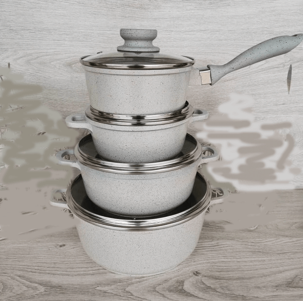 В комплект входит три мраморных кастрюли с крышками и мраморный ковшик, 3-х слойное антипригарное покрытие не влияет на вкус и запах пищи и предотвращает пригорание. Этот кухонный набор не содержит вредных веществ в своём составе и позволяет готовить пищу с минимальным количеством масла. Идеально для приготовления низкокалорийной, диетической еды.