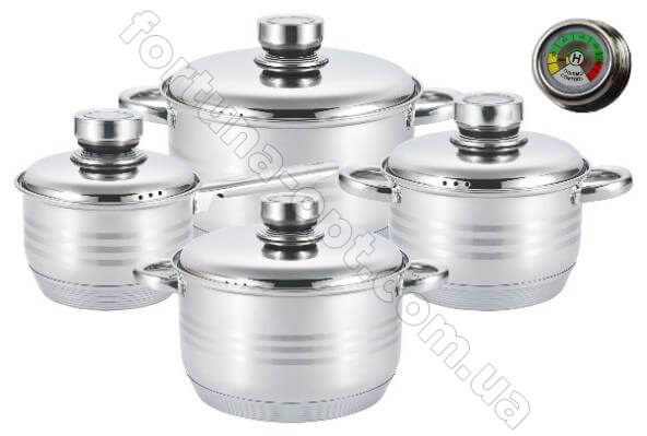 Кастрюли выполнены из прочной высококачественной нержавеющей стали, которая отвечает всем требованиям и не содержит вредные вещества в составе. Одним из главных преимуществ посуды является то, что изделия можно использовать на индукционных плитах. Девятислойное дно прогревается за считанные минуты, что обеспечивает равномерное распределение тепла по всей поверхности. Эргономичные стальные ручки помогут быстро снять посуду с огня, когда пища будет готова. После эксплуатации кастрюли легко очищаются, также их можно отправить в посудомоечную машину. Набор прослужит Вам долго и качественно!Характеристики набора посуды Edenberg EB - 3702