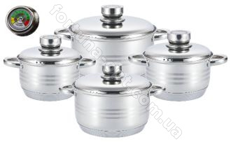 Кастрюли выполнены из прочной высококачественной нержавеющей стали, которая отвечает всем требованиям и не содержит вредные вещества в составе. Одним из главных преимуществ посуды является то, что изделия можно использовать на индукционных плитах. Девятислойное дно прогревается за считанные минуты, что обеспечивает равномерное распределение тепла по всей поверхности. Эргономичные стальные ручки помогут быстро снять посуду с огня, когда пища будет готова. После эксплуатации кастрюли легко очищаются, также их можно отправить в посудомоечную машину. Набор прослужит Вам долго и качественно!