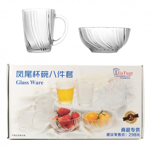 Набор из 8 предметов: кружки 4 шт. объемом 320 мл и салатники 4 шт. диаметром 130 мм. Материал: стекло.