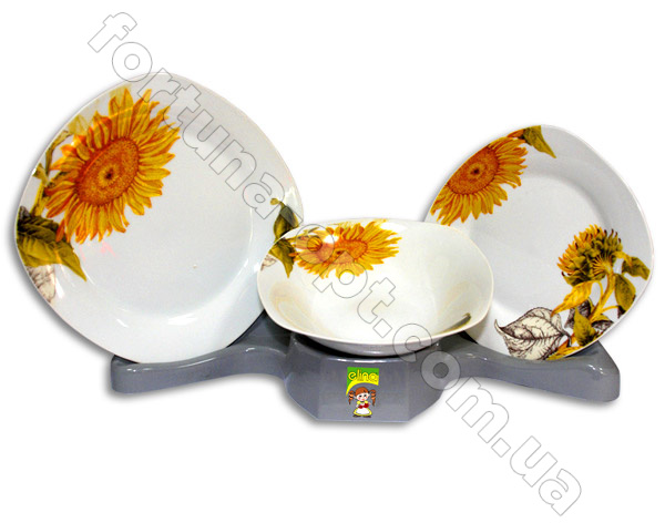 состав:подставная тарелка - 6 штук,диаметр 23 см. Суповая тарелка - 6 штук,диаметр 20,5 см.Десертная тарелка - 6 штук,