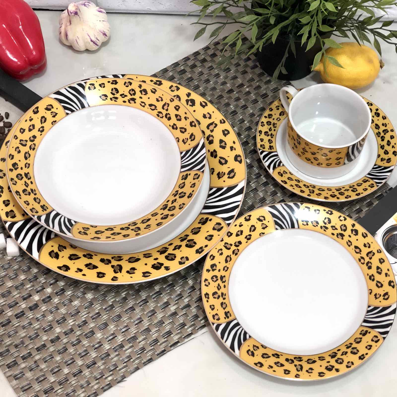 Cостав:подставная тарелка - 6 штук,диаметр - 26,5 см. Суповая тарелка - 6 штук,диаметр - 20,5 см.Десертная тарелка - 6 штук,диаметр -19 см.Чашки (220 мл.) - 6 штук,блюдца - 6 штук.