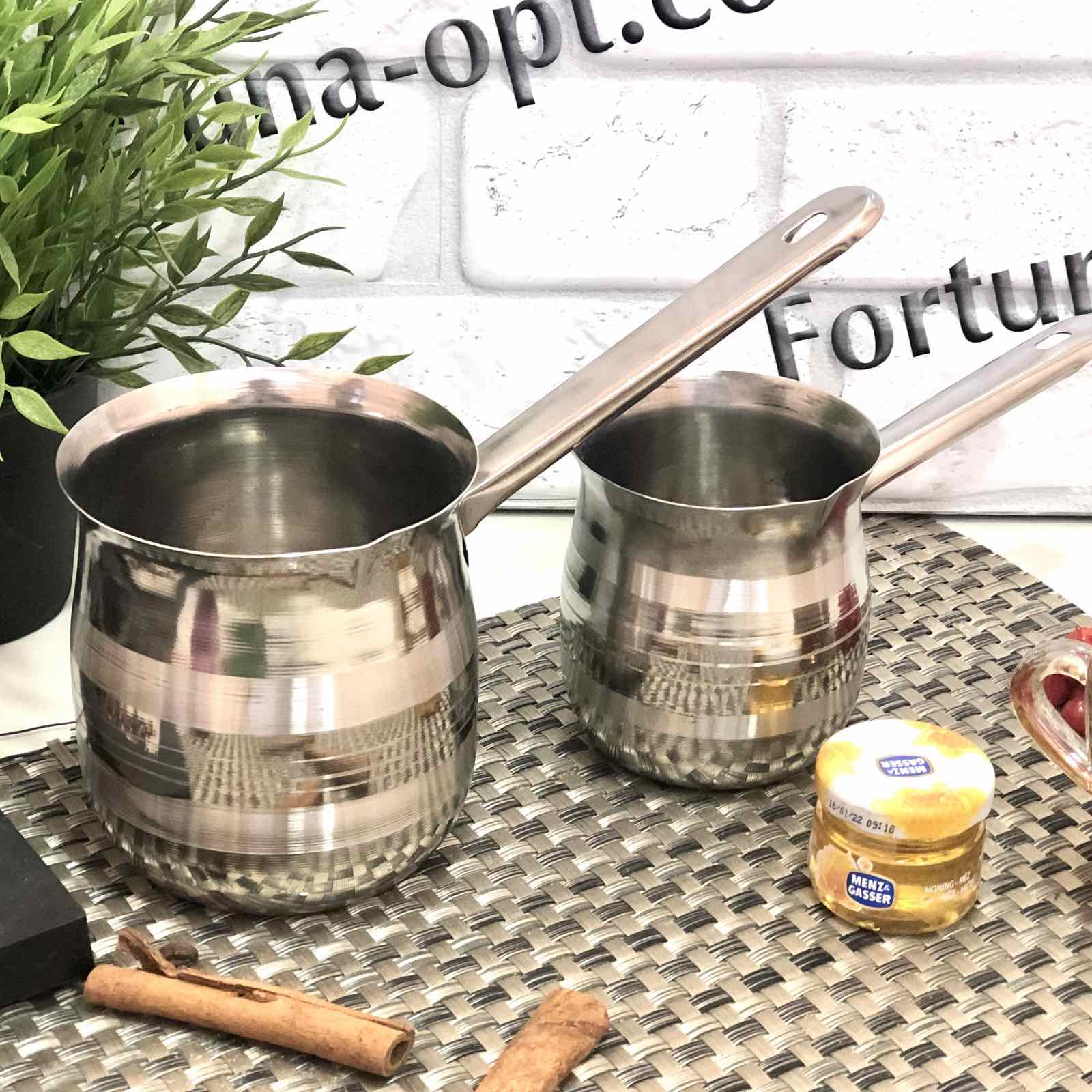 Набор турок (2 шт.) из нержавеющей стали объемом 350 мл и 750 мл. Нержавеющая сталь не вступает в реакцию с напитком во время приготовления, а значит не меняет ее вкус и запах. Кофеварка подходит для заваривания кофе, чая или различных трав или подогрева жидкостей. Такая посуда прочная и долговечная. Легко очищается даже в прохладной воде. Многофункциональный набор имеет современный дизайн и занимает минимум места на кухне.Особенности набора турок нержавейка Empire EM - 1561