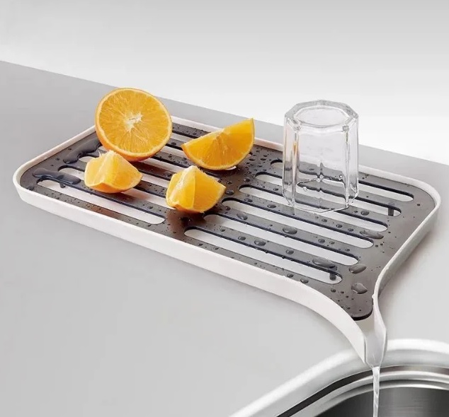 Сушилка-доска со сливом для кухонных приборов и продуктов. Состоит из двух частей: контейнер со сливным носиком и решетка.